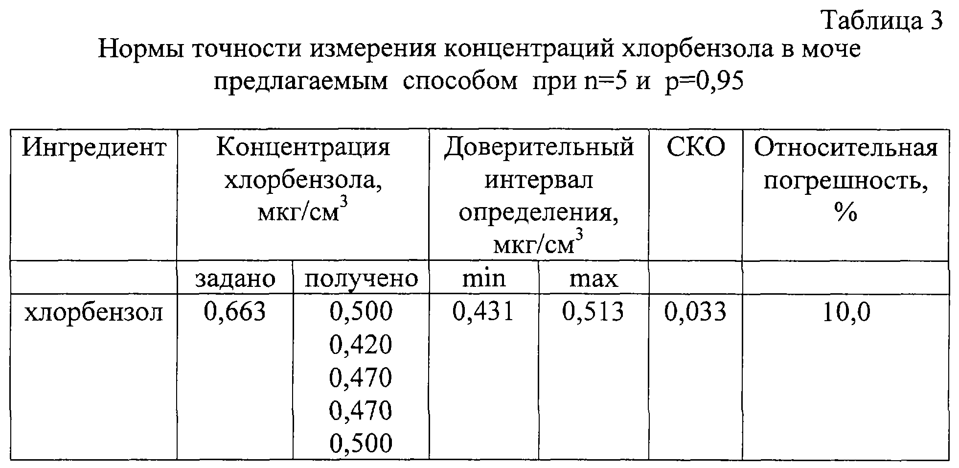 Также в ходе испытаний было установлено, что погрешность определения хлорбензола предлагаемым способом составляет 10,00%. Нормы точности измерения концентраций хлорбензола приведены в табл.3.