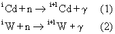 На фиг.3 представлены расчетные данные по вкладу в события радиационного захвата в кадмии и вольфраме разных энергетических групп спектра. Из этих данных видно, что число событий захвата на тепловых нейтронах в основном обусловлено кадмием, а в области резонансных нейтронов – вольфрамом (W). Полученный результат объясняется тем, что в естественном вольфраме наибольшее значение сечения захвата приходится на область резонансных нейтронов, а в таких элементах, как кадмий, наибольшее сечение приходится на тепловые нейтроны.