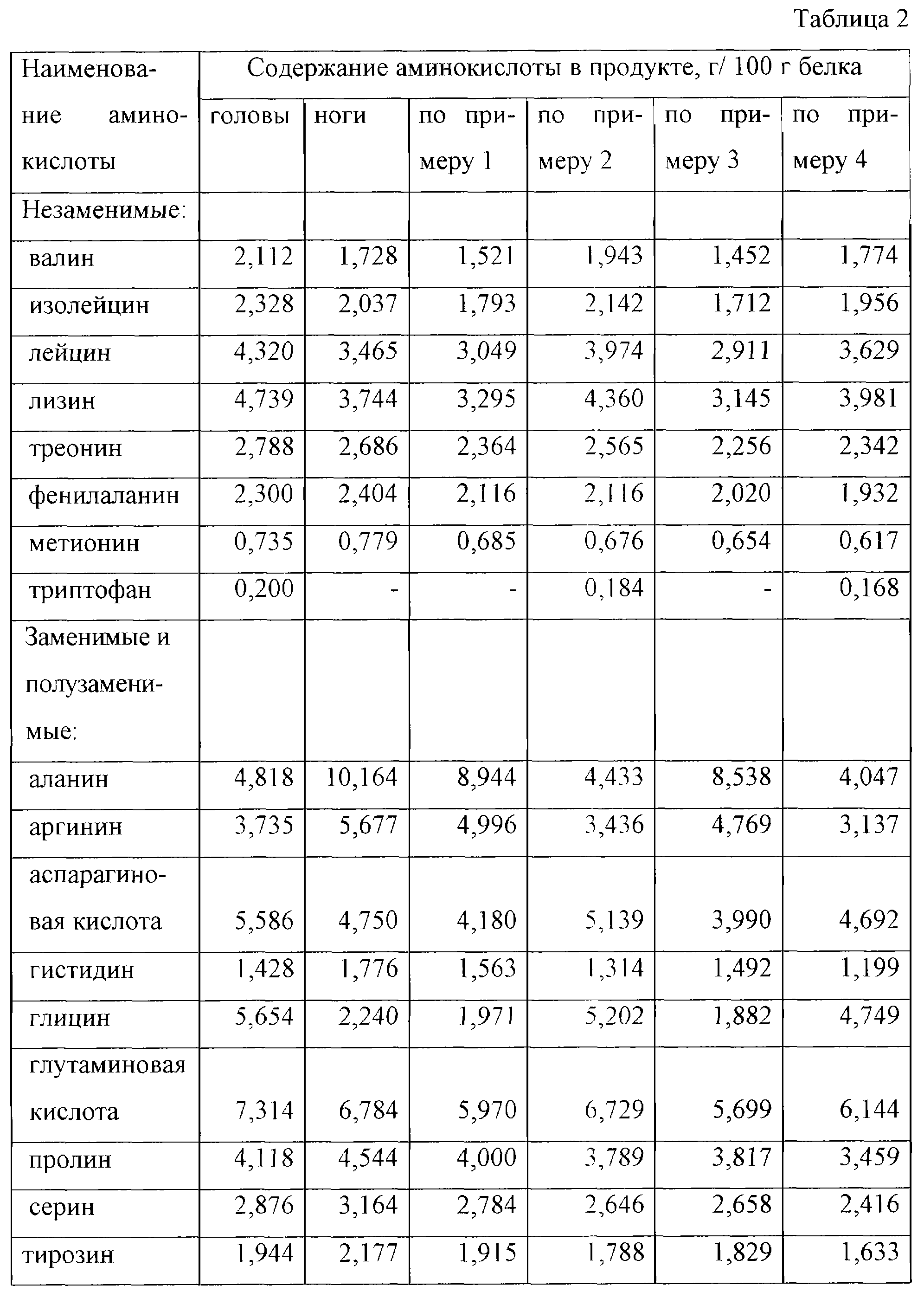 Пример 1. Белковую пищевую добавку из ног птицы получают следующим образом. Ноги птицы промывают водой, проводят их предварительную тепловую обработку в автоклаве при температуре 120-123 С, давлении 0,1 МПа в течение 30 мин, затем измельчают сырье на волчке с диаметром отверстий решетки 2-3 мм, добавляют воду в соотношении 1:15 и перемешивают. Полученный гомогенизат обезжиривают, отделяя образовавшийся слой жира на центрифуге. Затем доводят рН среды до 7,0-7,2 путем внесения 1н. раствора гидроксида натрия. Далее проводят ферментативный гидролиз внесением раствора ферментного препарата коллагеназы из расчета 30-50 единиц протеолитической активности (ПС) на 1 г белка обрабатываемого сырья. Процесс гидролиза ведут при постоянном перемешивании и температуре 40 С в течение 2,5-3 ч. После этого гидролизат нагревают до температуры 95-100 С и выдерживают 10-15 мин для инактивации ферментов. Далее отделяют осадок путем центрифугирования или сепарирования. Полученный гидролизат высушивают на распылительной сушилке.
