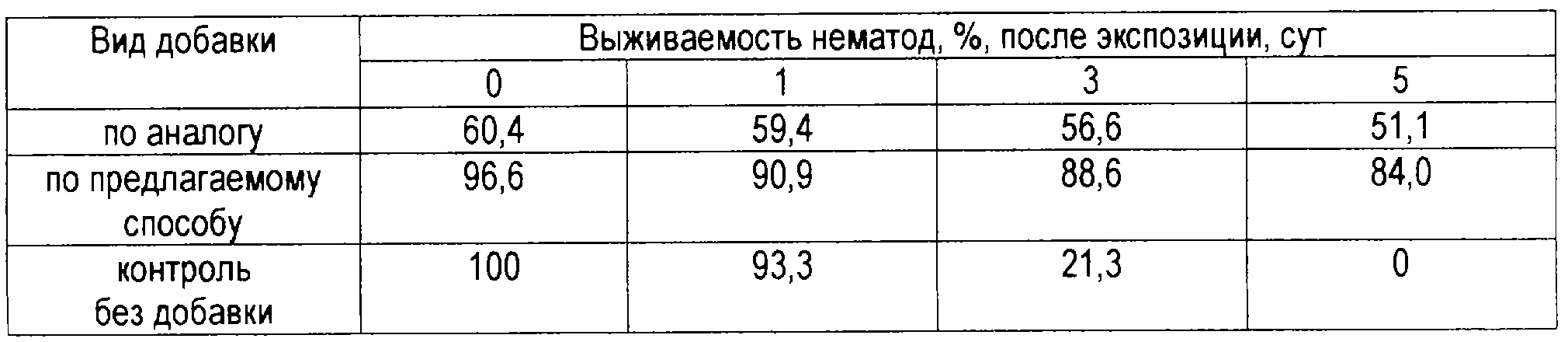 Как видно из таблицы, динамика выживаемости нематод в препарате по предлагаемому способу подтверждает возможность сокращения их расхода по сравнению с наиболее близким аналогом за счет возможности получения препаратов с одинаковой активностью при уменьшении первоначального содержания нематод, поскольку активность препарата определяется концентрацией живых нематод.