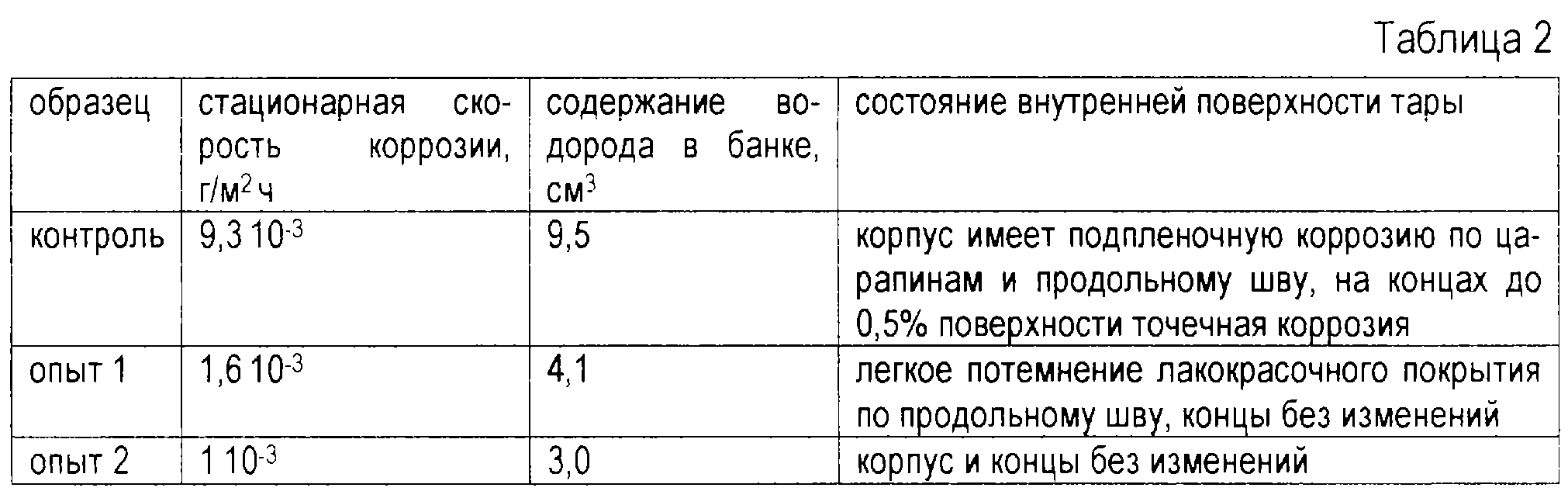 Целевой продукт, полученный по описанной технологии, отличается от полученного по стандартной технологии меньшим количеством разваренного сырья, меньшей коррозионной активностью, отсутствием замутнений и осадка в заливочной жидкости, лучшим сохранением окраски плодов. Наилучшим образом эти отличия заметны при консервировании вишни. Органолептические показатели консервов “Вишня натуральная” в сварной банке №13, полученных по предлагаемому способу с добавлением препарата из биомассы микромицета Mortierella nantahalensis в количестве 0,2% (опыт 1) и 0,5% (опыт 2) по массе консервов и контрольных консервов, полученных по наиболее близкому аналогу, после 12 месяцев хранения приведены в табл.1, данные по коррозионной активности тех же образцов – в табл.2.