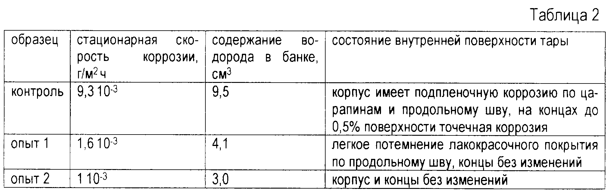 Целевой продукт, полученный по описанной технологии, отличается от полученного по стандартной технологии меньшим количеством разваренного сырья, меньшей коррозионной активностью, отсутствием замутнений и осадка в заливочной жидкости, лучшим сохранением окраски плодов. Наилучшим образом эти отличия заметны при консервировании вишни. Органолептические показатели консервов “Вишня натуральная” в сварной банке №13, полученных по предлагаемому способу с добавлением препарата из биомассы микромицета Mortierella spinosa var. sterilis в количестве 0,2% (опыт 1) и 0,5% (опыт 2) по массе консервов, и контрольных консервов, полученных по наиболее близкому аналогу, после 12 месяцев хранения приведены в таблице 1, данные по коррозионной активности тех же образцов в таблице 2.