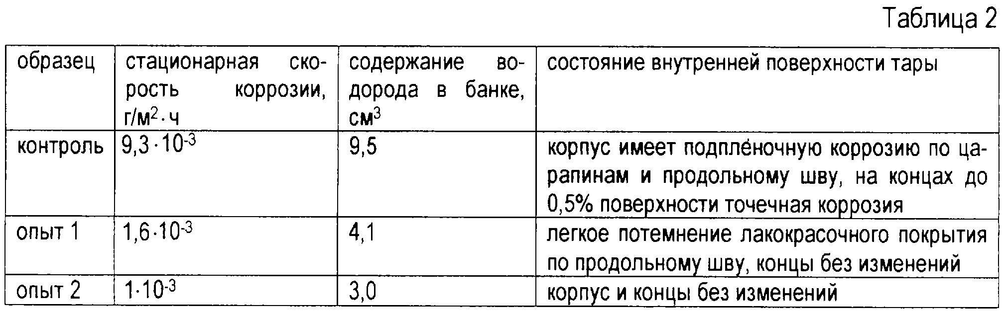 Целевой продукт, полученный по описанной технологии, отличается от полученного по стандартной технологии меньшим количеством разваренного сырья, меньшей коррозионной активностью, отсутствием замутнений и осадка в заливочной жидкости, лучшим сохранением окраски плодов. Наилучшим образом эти отличия заметны при консервировании вишни. Органолептические показатели консервов “Вишня натуральная” в сварной банке №13, полученных по предлагаемому способу с добавлением препарата из биомассы микромицета Mortierella nigrescens в количестве 0,2% (опыт 1) и 0,5% (опыт 2) по массе консервов, и контрольных консервов, полученных по наиболее близкому аналогу, после 12 месяцев хранения приведены в таблице 1, данные по коррозионной активности тех же образцов – в таблице 2.