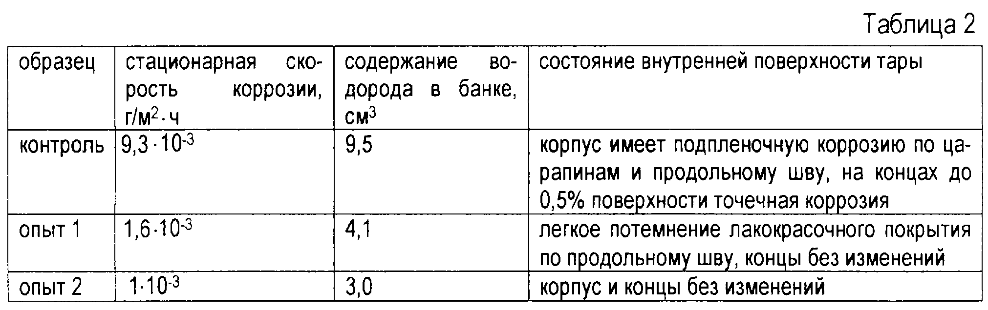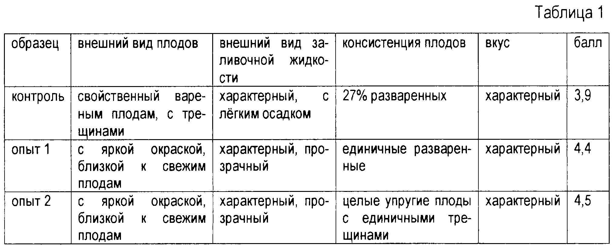 Целевой продукт, полученный по описанной технологии, отличается от полученного по стандартной технологии меньшим количеством разваренного сырья, меньшей коррозионной активностью, отсутствием замутнений и осадка в заливочной жидкости, лучшим сохранением окраски плодов. Наилучшим образом эти отличия заметны при консервировании вишни. Органолептические показатели консервов “Вишня натуральная” в сварной банке №13, полученных по предлагаемому способу с добавлением препарата из биомассы микромицета Pythium gracile в количестве 0,2% (опыт 1) и 0,5% (опыт 2) по массе консервов, и контрольных консервов, полученных по наиболее близкому аналогу, после 12 месяцев хранения приведены в табл.1, данные по коррозионной активности тех же образцов – в табл.2.