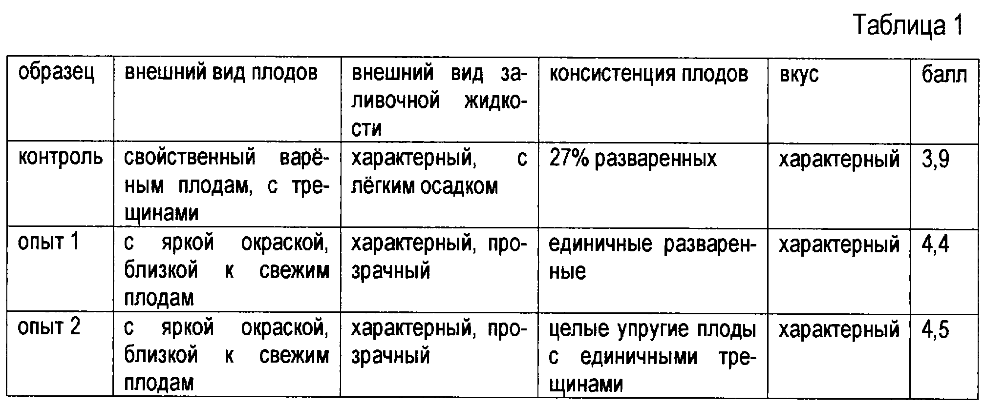 Целевой продукт, полученный по описанной технологии, отличается от полученного по стандартной технологии меньшим количеством разваренного сырья, меньшей коррозионной активностью, отсутствием замутнений и осадка в заливочной жидкости, лучшим сохранением окраски плодов. Наилучшим образом эти отличия заметны при консервировании вишни. Органолептические показатели консервов “Вишня натуральная” в сварной банке №13, полученных по предлагаемому способу с добавлением препарата из биомассы микромицета Mortierella jenkinii в количестве 0,2% (опыт 1) и 0,5% (опыт 2) по массе консервов и контрольных консервов, полученных по наиболее близкому аналогу, после 12 месяцев хранения приведены в таблице 1, данные по коррозионной активности тех же образцов в таблице 2.