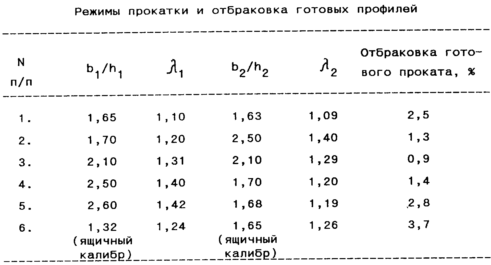 Из таблицы следует, что при реализации предложенного способа (варианты 2-4) достигается повышение качества профилей, их отбраковка минимальна. В случаях запредельных значений заявленных параметров (варианты 1 и 5) качество готовых профилей ухудшается, а отбраковка готового проката соответственно увеличивается. Также более низкое качество профилей и увеличенная отбраковка имеют место при реализации способа-прототипа (вариант 6). Происходит это вследствие дефектообразования и неравномерного износа черновых калибров непрерывного стана.