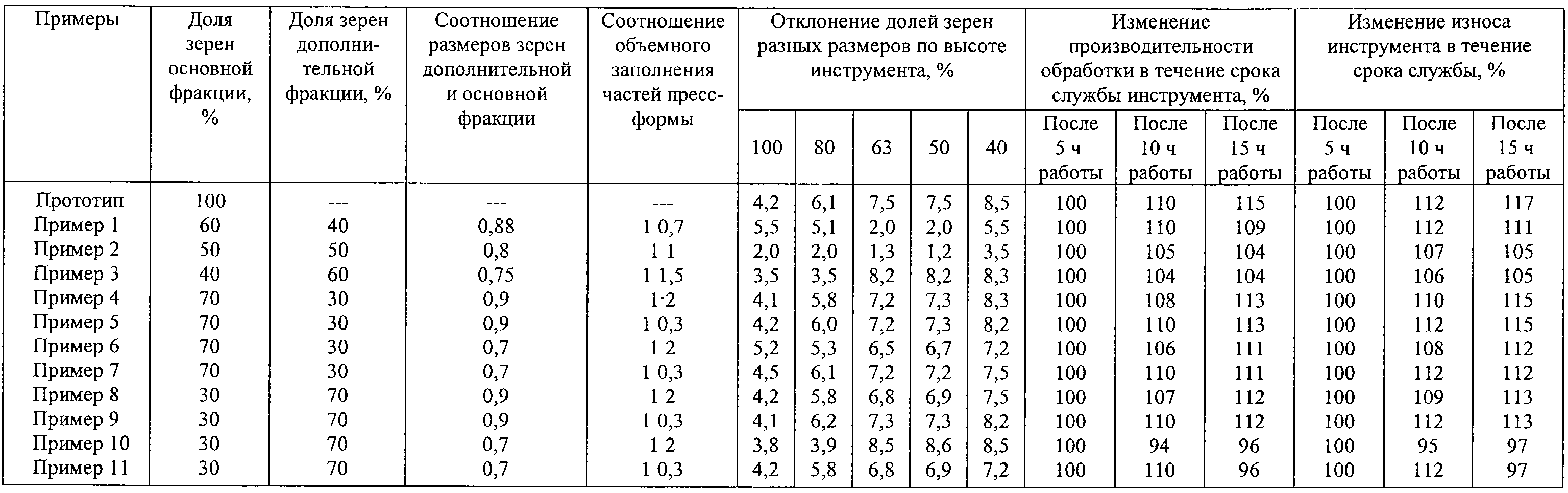 Пример 3. Для изготовления абразивного изделия зерна электрокорунда основной фракции размерами 80 мкм смешивают с абразивными зернами электрокорунда дополнительной фракции размерами 60 мкм (отношение размеров зерен дополнительной фракции к основной 0,75) при содержании первых в смеси 40%, тщательно перемешивают и засыпают в нижнюю часть пресс-формы. Затем в верхнюю часть пресс-формы засыпается порошок основной фракции при соотношении объемного заполнения ее частей 1:1,5. После заполнения пресс-формы производят статическое нагружение заготовки. Затем, не снимая статической нагрузки, производят динамическое нагружение электрогидравлической ударной волной мощностью 0,65 МВт/г массы формообразуемого порошка, после чего изделие извлекают из пресс-формы, помещают в печь и термообрабатывают при 1500 С в течении 3 ч. При хонинговании на указанных режимах максимальное отклонение производительности обработки в течение всего срока службы инструмента от начальной составило +4% (у известного +15%), максимальное отклонение износа инструмента +6% (у известного +17%). Примеры получения абразивных изделий приведены в таблице.