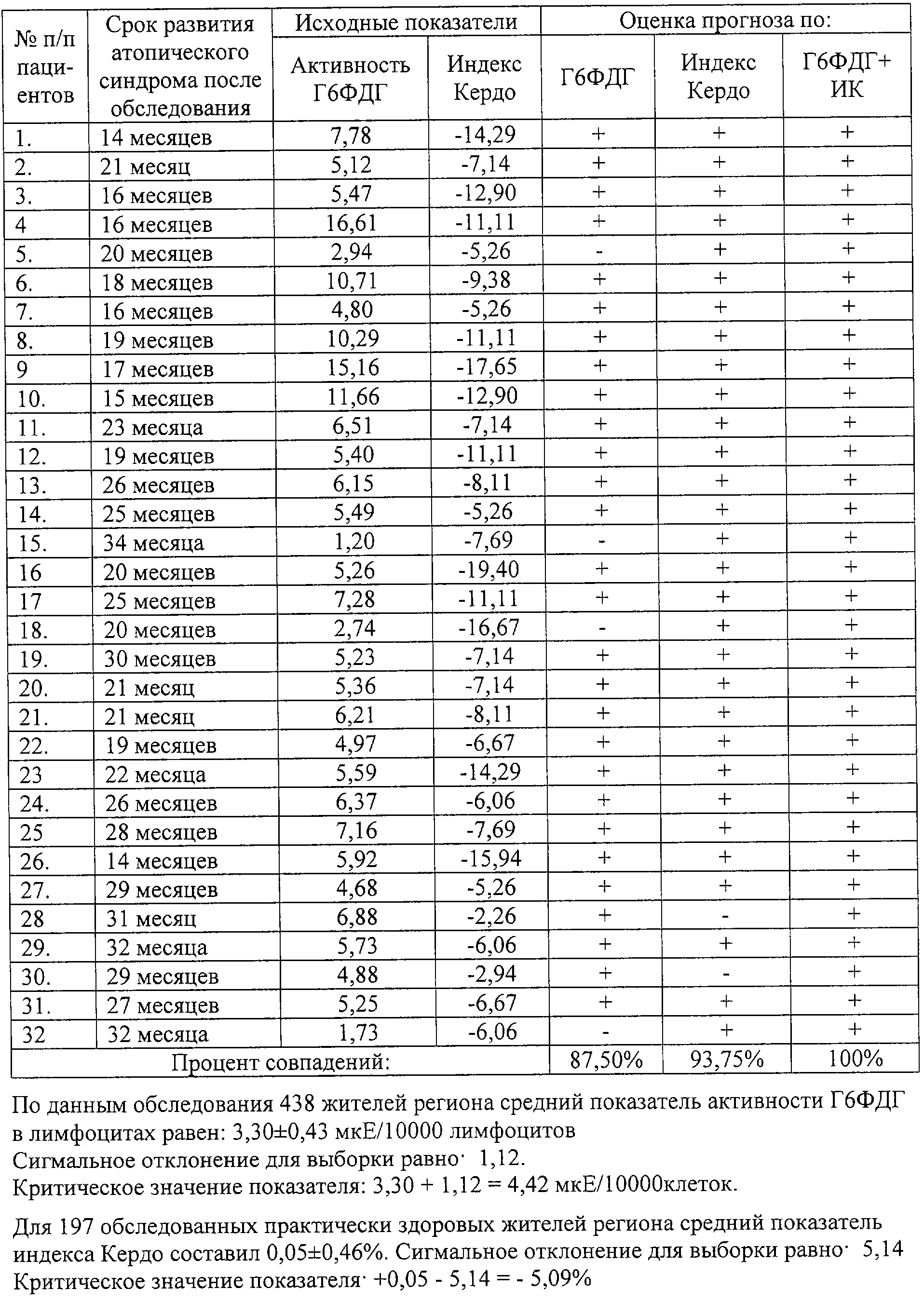 (57) Реферат: Изобретение относится к медицине и может быть использовано в терапии и клинической аллергологии и иммунологии. Для этого у практически здорового на момент обследования пациента определяют активность фермента глюкозо-6-фосфатдегидрогеназы (Г6ФДГ) в лимфоцитах крови и оценивают характер вегетативной регуляции организма к индексу Кердо (ИК); при превышении активности Г6ФДГ критического значения, равного 4,42 мкЕ/10000 клеток, и величине ИК менее – 5,09% прогнозируют развитие атопического синдрома с точностью до 100%. Способ позволяет прогнозировать развитие атопического синдрома до появления каких-либо его симптомов у практически здоровых на момент обследования лиц. 1 табл. Изобретение относится к медицине и может быть использовано в терапии, клинической аллергологии и иммунологии. Актуальность прогноза развития атопического синдрома связана с прогрессивным ростом его проявлений среди населения и развитием на этом фоне тяжелой аллергопатологии. Источников по прогнозированию развития атопического синдрома у практически здоровых на момент обследования людей в доступной литературе нами не обнаружено. Целью предлагаемого способа является прогноз развития атопического синдрома с клиническими проявлениями аллергических реакций немедленного типа в течение ближайших 3 лет. Цель достигают за счет того, что у практически здорового на момент обследования пациента определяют активность фермента глюкозо-6-фосфатдегидрогеназы (Г6ФДГ) в лимфоцитах крови и величину вегетативного индекса Кердо (ИК) и при превышении активности ГбФДГ 4,42 мкЕ/10000 клеток и величины ИК менее -5,09% прогнозируют развитие атопического синдрома в ближайшие 3 года с точностью до 100%. Выбор указанных показателей обусловлен тем, что, во-первых, по активности Г6ФДГ, ключевого фермента пентозофосфатного пути внутриклеточного метаболизма, можно судить о способности клетки к синтезу цитокинов, иммуноглобулина Е. Последние играют ведущую роль в механизмах развития атопического синдрома (Чучалин А.Г. Бронхиальная астма: В 2-х т. – М.: Агар, 1997. – 830 с.). Во-вторых, так как вегетативная нервная система определяет направленность метаболических процессов в организме и иммунокомпетентных клетках, то другим используемым нами показателем явился индекс Кердо (Ассман Д. Чувствительность человека к погоде.: Пер. с нем. – Л.,1966. – 212 с.). Он характеризует преобладающее влияние на момент исследования одного из отделов вегетативной нервной системы – симпатического или парасимпатического – на физиологические функции организма. Положительные цифры ИК свидетельствуют о преобладании у индивида симпатоадреналовой системы, отрицательные – парасимпатической. Индекс вычисляют по результатам определения артериального давления и частоты пульса по следующей формуле: ИК=(1 – ДД/Р8)*100%; где ДД – показатель диастолического давления, PS – частота пульса. Предлагаемый способ реализуют следующим образом. Активность Г6ФДГ определяют методом биолюминесценции с бактериальной люциферазой (Савченко А.А., Сунцова Л.Н. – Лаб. дело. -1989. – №11. – С.23-25.) в 10-12 тысячах лимфоцитов, выделенных из периферической крови обследуемого. При условии увеличения активности Г6ФДГ выше 4,42 мкЕ/10000 клеток (“критический” уровень показателя, равный сумме среднего показателя 3,30 мкЕ/10000 клеток и одного сигмальног