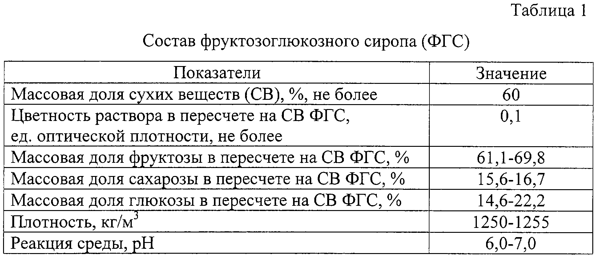 Сахароза при изготовлении мороженого является одним из основных видов применяемого сырья, так как несет технологическую и физиологическую функции. Она придает вкус изделиям и участвует в образовании структуры. Однако при этом применение сахарозы имеет ряд недостатков: 1 – сахароза высококалорийна; 2 – нарушает баланс витамина B1, и 3 – продукты, обогащенные сахарозой, противопоказаны при заболеваниях обмена веществ, сахарном диабете и т.д. Для устранения этих недостатков, а также для повышения пищевой и биологической ценности мороженого нами используется растительная фруктозоглюкозная добавка, полученная из топинамбура (Патент № 2059730, опубл. 10.05.96. Бюл. № 13). Для производства нового продукта растительная добавка может быть использована в виде сиропа. Состав фруктозоглюкозного сиропа и его физико-химические показатели представлены в табл.1.