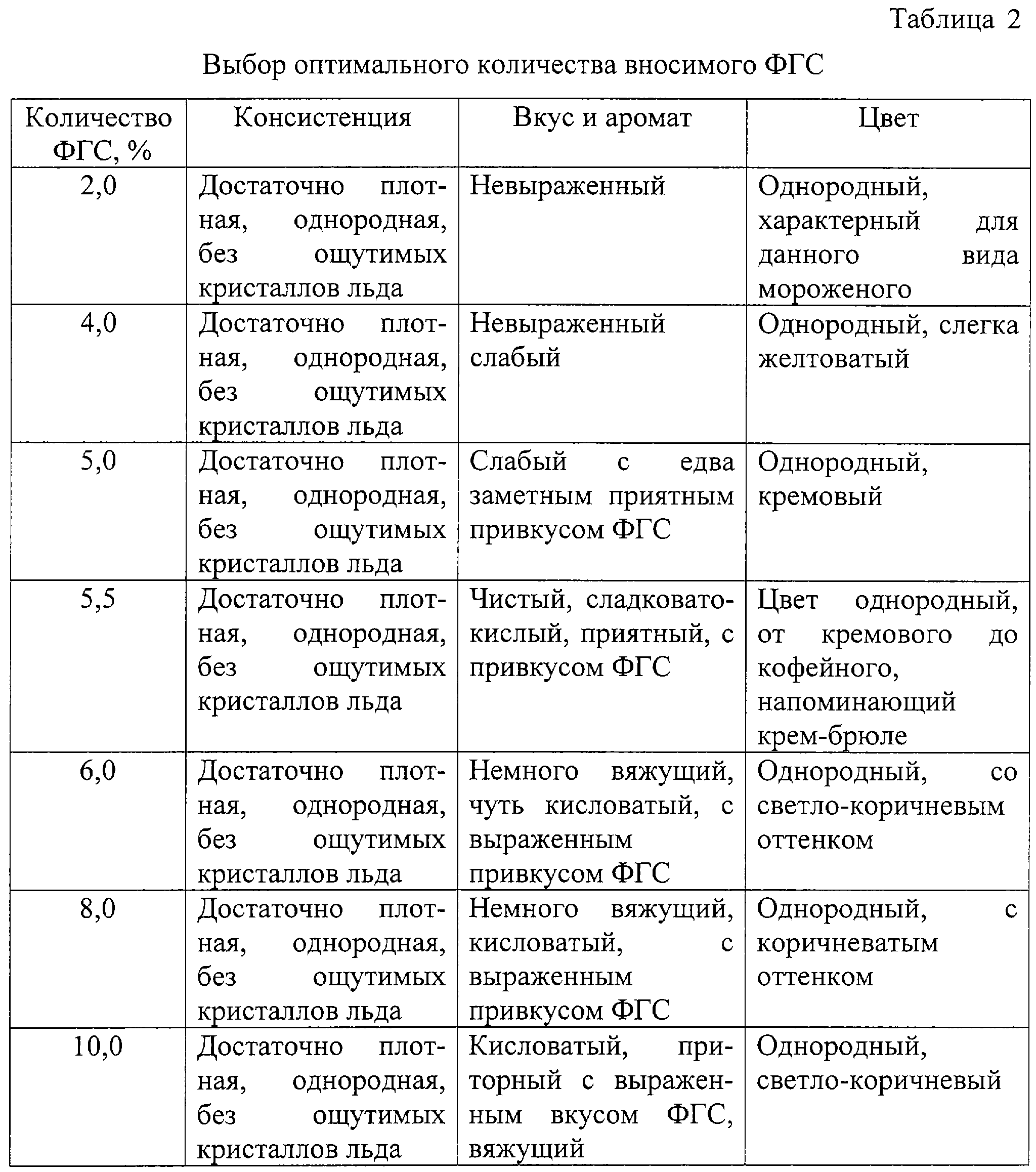 На основании опытных данных нами установлено оптимальное количество вносимого фруктозоглюкозного сиропа (табл. 2), содержание которого варьировали в интервале от 1 до 10% от массы смеси с учетом органолептических показателей и сладкого вкуса углеводсодержащих компонентов. При этом сладость сахарозы принимали за 100%. У лактозы, относительно сахарозы, сладость равнялась 16%; у глюкозы – 74%; а у фруктозы – 173%. Практически доказано, что внесение сиропа больше 5,5% нецелесообразно, так как тогда появляется коричневатый оттенок смеси и мороженое имеет сладковато-приторный вкус. Цвет готового продукта при содержании ФГС больше 5,5-6,0% не очень привлекателен для потребителя.