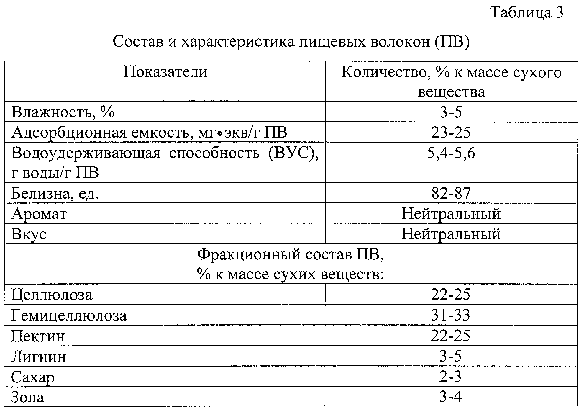 В качестве стабилизатора нами применялись осветленные пищевые волокна, полученные из боя и хвостиков сахарной свеклы (Патент № 2128928, опубл. 10.04.1998. Бюл. № 11). Добавление к мороженому пищевых волокон обусловлено высоким содержанием в них клетчатки, гимицеллюлозы и пектиновых веществ. Фракционный состав и характеристика применяемых пищевых волокон, полученных из боя и хвостиков сахарной свеклы, представлены в табл. 3.