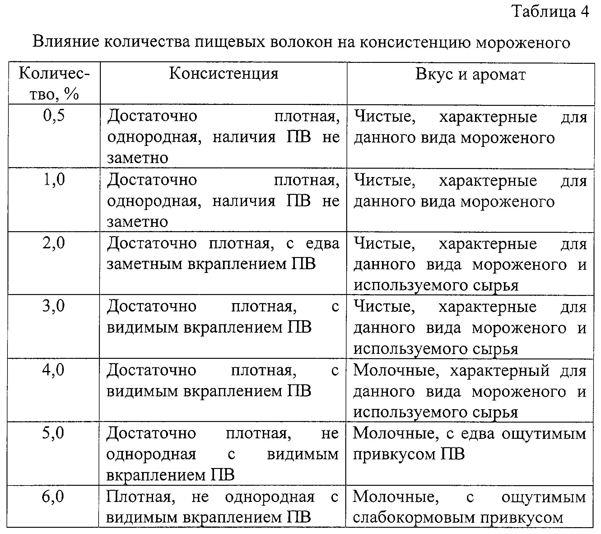 Вкус и аромат готового продукта, выработанного по примеру 3, имеет молочный едва ощутимый слабокормовой привкус, сладкоприторный, слегка вяжущий вкус, консистенция плотная, с ощутимым включением ПВ, без органолептически ощутимых комочков жира и стабилизатора, цвет из-за большого содержания ПВ неоднородный, неприятно коричневый, не характерный для данного вида мороженого. Качество продукта не соответствует предъявленным требованиям.