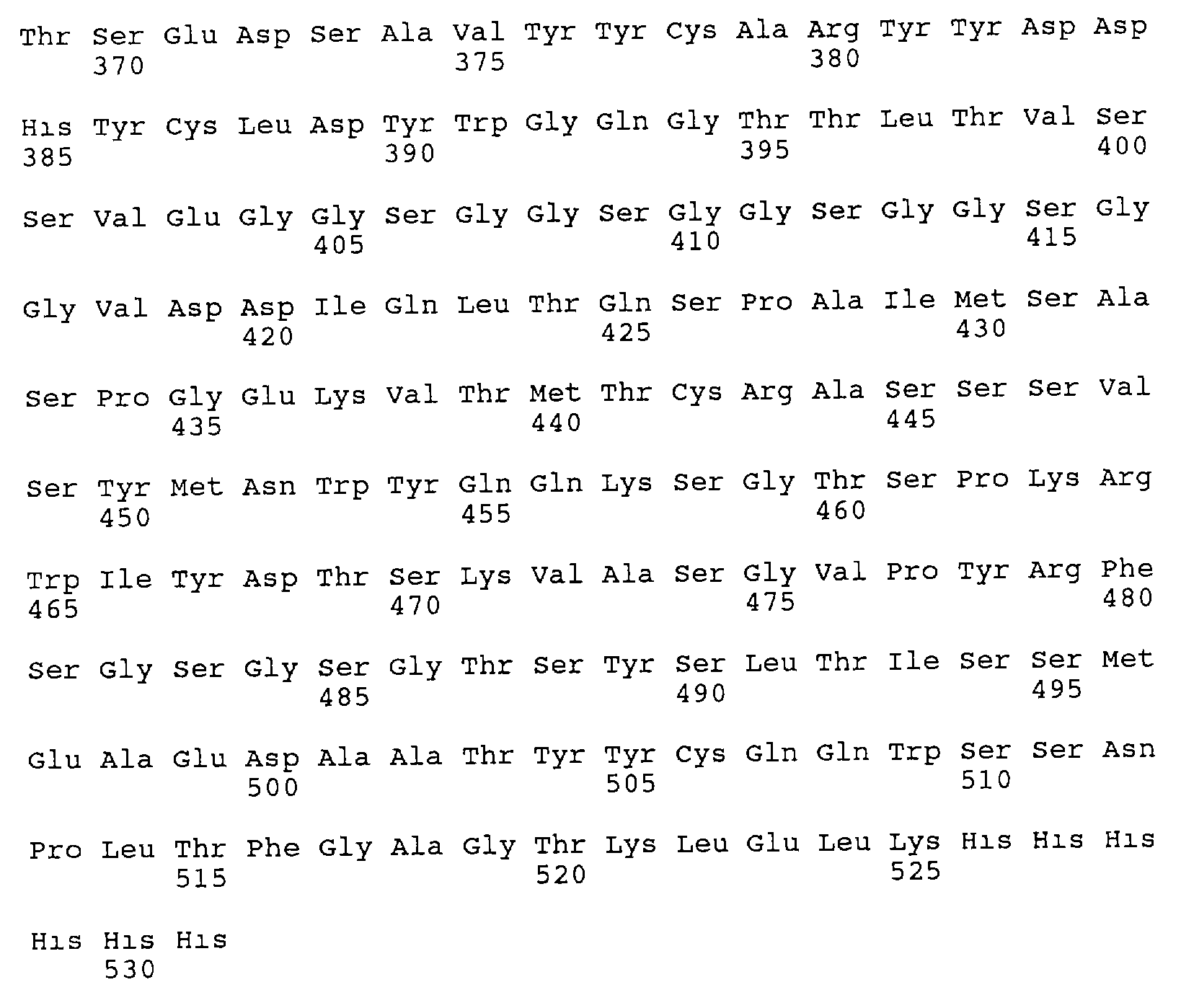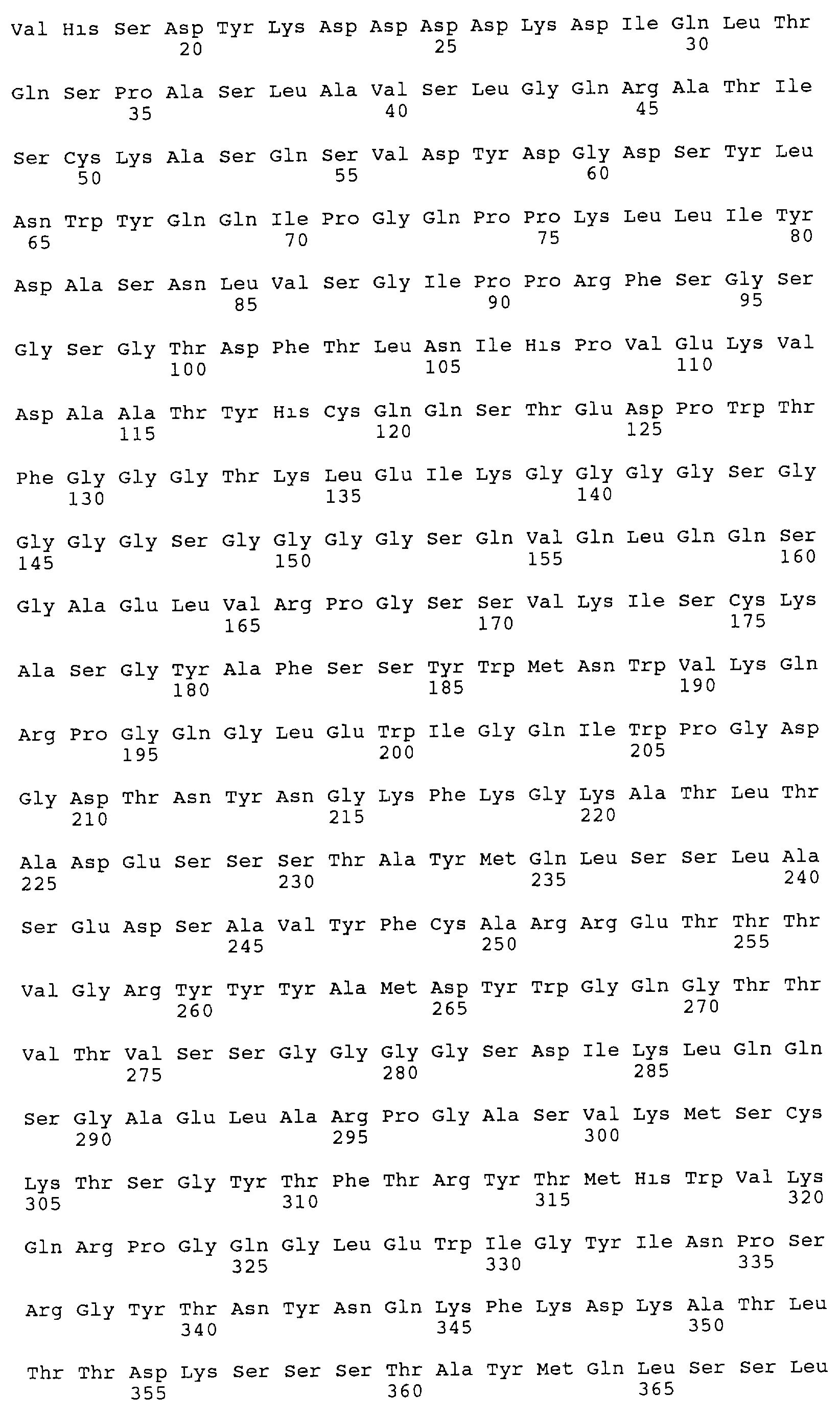 Кроме того, последовательность, которая обладает способностью избирательно связываться с твердой подложкой, может представлять собой положительно или отрицательно заряженную аминокислотную последовательность, содержащую цистеин-аминокислотную последовательность, авидин, стрептавидин, функционально активный фрагмент протеина A Staphylococcus, GST, His-метку, FLAG-метку или Lex А. Как описано в приведенных ниже примерах, полипептид по изобретению, примером которого является одноцепочечное антитело, также экспрессировали с FLAG-меткой на N-конце и/или с His-меткой на С-конце, что облегчает его очистку и определение. Используемая в примере FLAG-метка (см. фиг.8), состоит из 8 аминокислот, и ее предпочтительно применяют согласно изобретению. Однако также предпочтительными являются используемые в примерах FLAG-метки, представляющие собой укороченные версии FLAG, такие как аминокислотная последовательность Asp-Tyr-Lys-Asp.