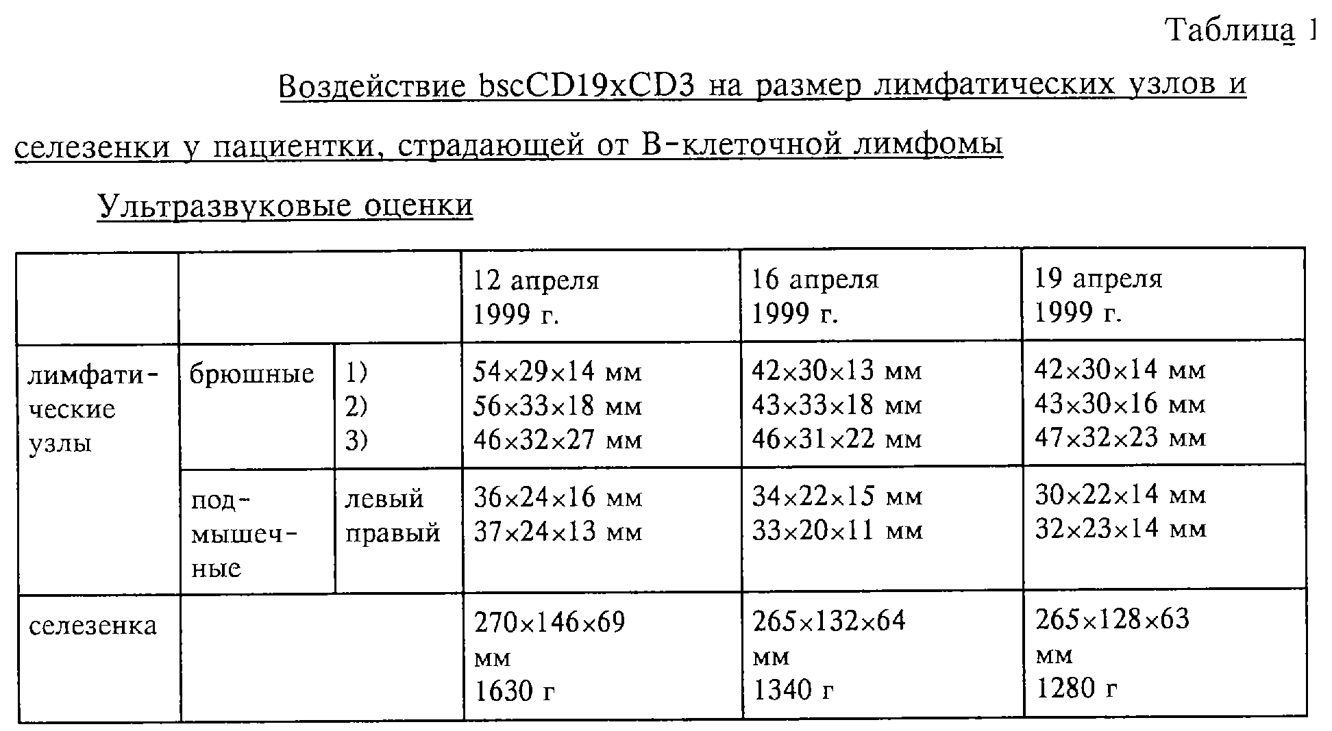 Ультразвуковое обследование селезенки и пяти брюшных и подмышечных лимфатических узлов проводили через 1 день и через 4 дня после введения второй дозы bscCD19 CD3. Уже через 1 день после введения дозы 10 мкг (16 апреля 1999 г.) обнаружено уменьшение размера лимфатических узлов, а также селезенки примерно на 20% по сравнению с исходным состоянием. Это наблюдение было подтверждено при втором ультразвуковом обследовании 19 апреля 1999 г. Вес селезенки уменьшился на 350 г (с 1630 г в исходном состоянии до 1280 г 19 апреля 1999 г.) (таблица 1; фиг.16).