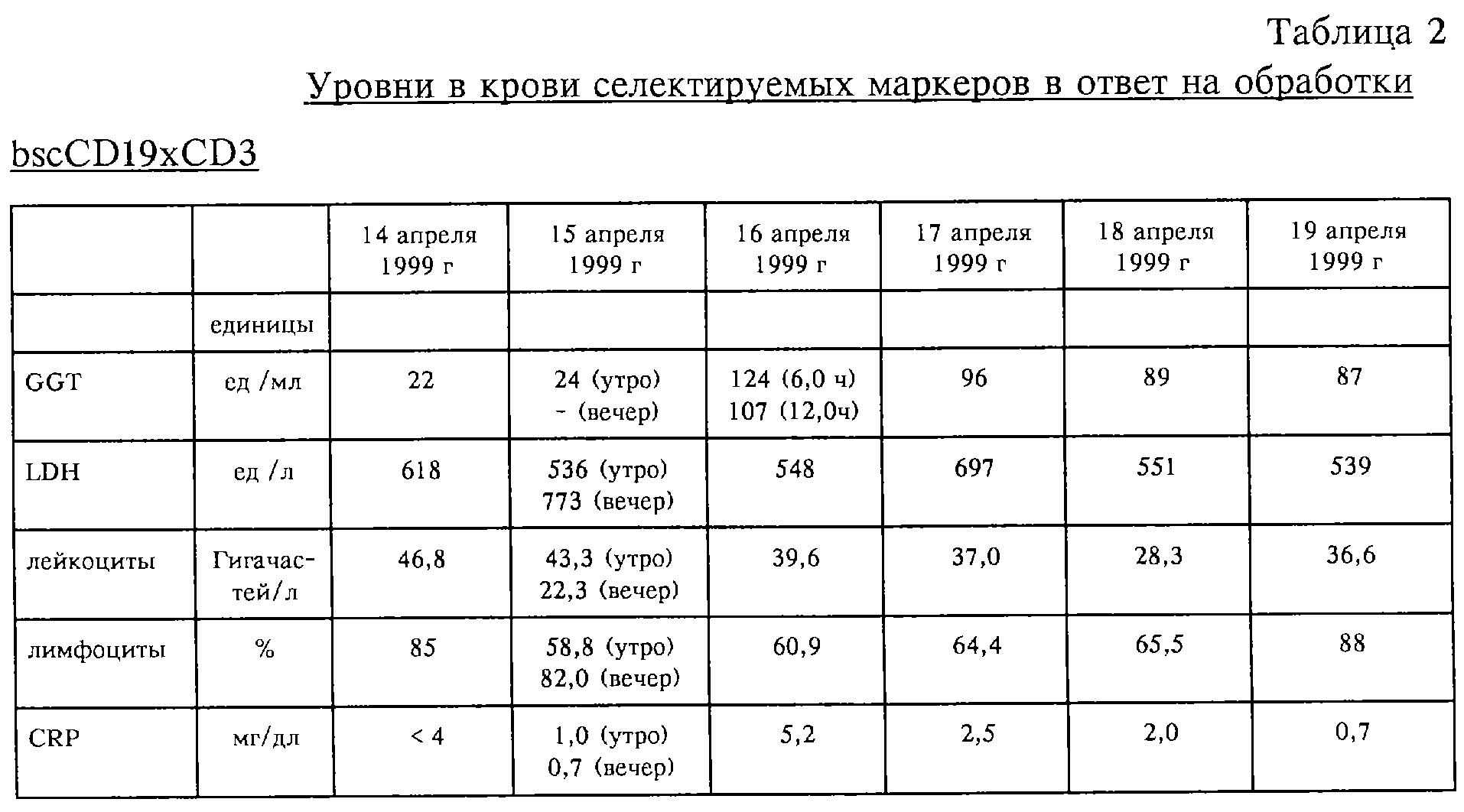Уровни в крови гамма-глутамилтрансферазы (GGT), лактат-дегидрогеназы (LDH) и С-реактивного протеина (CRP) определяли стандартными методами клинической биохимии и выражали в виде ед./мл (GGT), ед./л (LDH) и мг/дл (CRP). Количество лейкоцитов выражали в виде Гч./л, а количество лимфоцитов в виде процента от общего количества лейкоцитов. В первой колонке представлены данные об исходных уровнях на 14 апреля 1999 г. до начала лечения. Во второй колонке приведены данные о реакции на обработку 3 мкг bscCD19 CD3 (которая была проведена 14 апреля 1999 г.), полученные 15 апреля 1999 г. Данные о реакции на вторую обработку 10 мкг соединения, полученные в этот же день, приведены в третьей колонке. Уровни в крови селектрируемых маркеров на четвертый день после обработки лекарственным средством приведены в четырех последних колонках.
