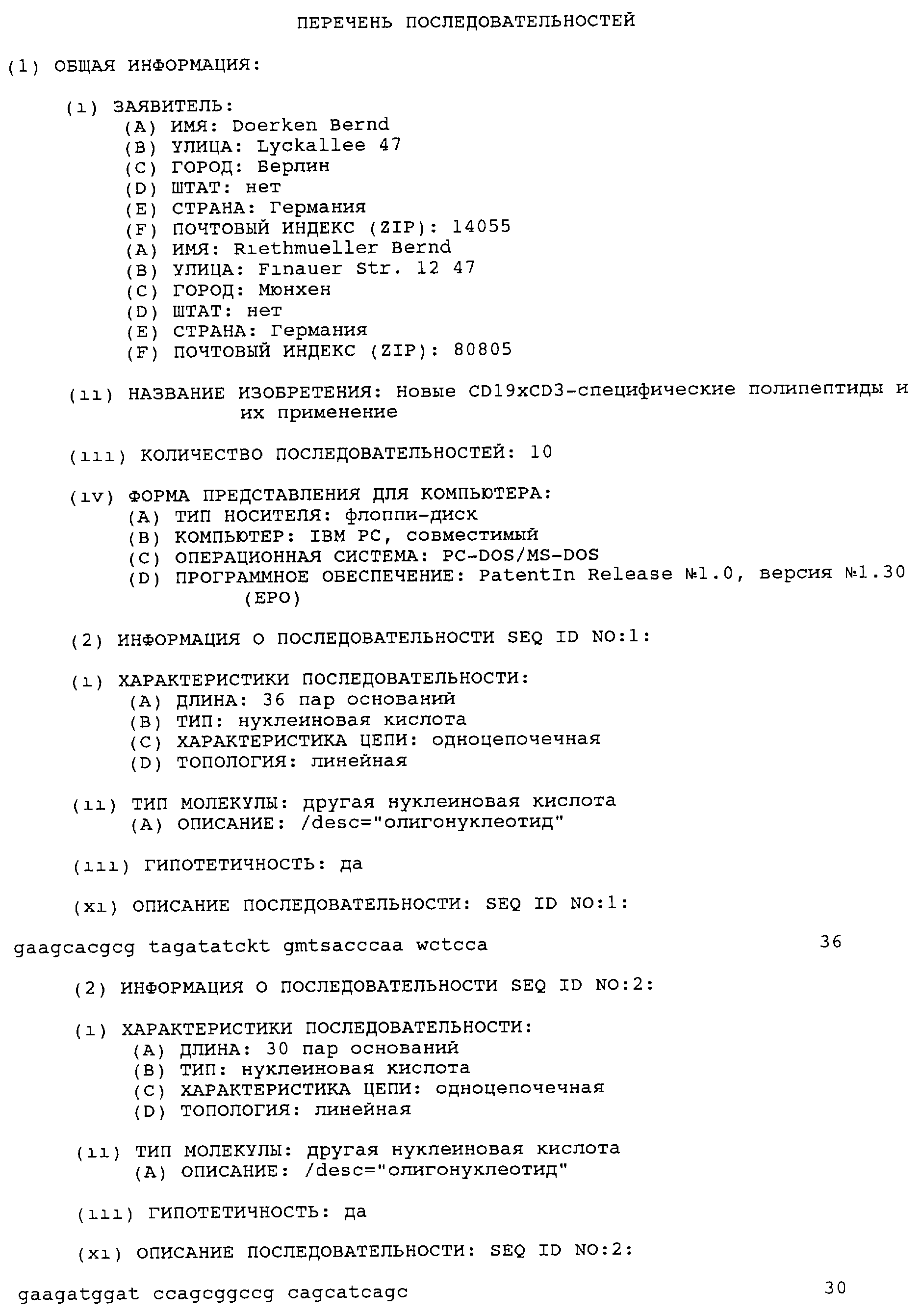 Таким образом, изобретение позволяет получить рекомбинантным путем полипептиды, включающие антигенсвязывающие участки, обладающие аффинностью и специфичностью в отношении эпитопа антигена CD19 и CD3 соответственно, и необязательно дополнительный функционально активный домен. Как ясно из вышеизложенного, изобретение относится к большому семейству полипептидов, включающих такие антигенсвязывающие участки, которые могут применяться для любых терапевтических и диагностических целей. Специалистам в данной области должно быть очевидно, что полипептиды по изобретению могут быть дополнительно слиты с другими описанными выше фрагментами, например, для направленного переноса лекарственного средства и с целью визуализации. Такое слияние может быть осуществлено химическим путем после экспрессии полипептидов с сайтом присоединения, или слитый продукт может быть создан в полипептиде по изобретению на уровне ДНК. ДНК затем экспрессируют в пригодной системе хозяина и полученные в результате экспрессии протеины собирают и при необходимости ренатурируют. Как описано выше, антигенсвязывающие участки предпочтительно получают из вариабельной области антител. В этой связи метод с использованием гибридом позволяет получить линии клеток, секретирующих антитело к практически любому требуемому веществу, которое вызывает иммунный ответ. Затем из цитоплазмы гибридомы может быть получена РНК, кодирующая легкие и тяжелые цепи иммуноглобулина. Согласно способу по изобретению, 5′-конец мРНК может использоваться для получения кДНК. Затем в клетках, предпочтительно в клетках млекопитающих может быть экспрессирована ДНК, кодирующая полипептиды.