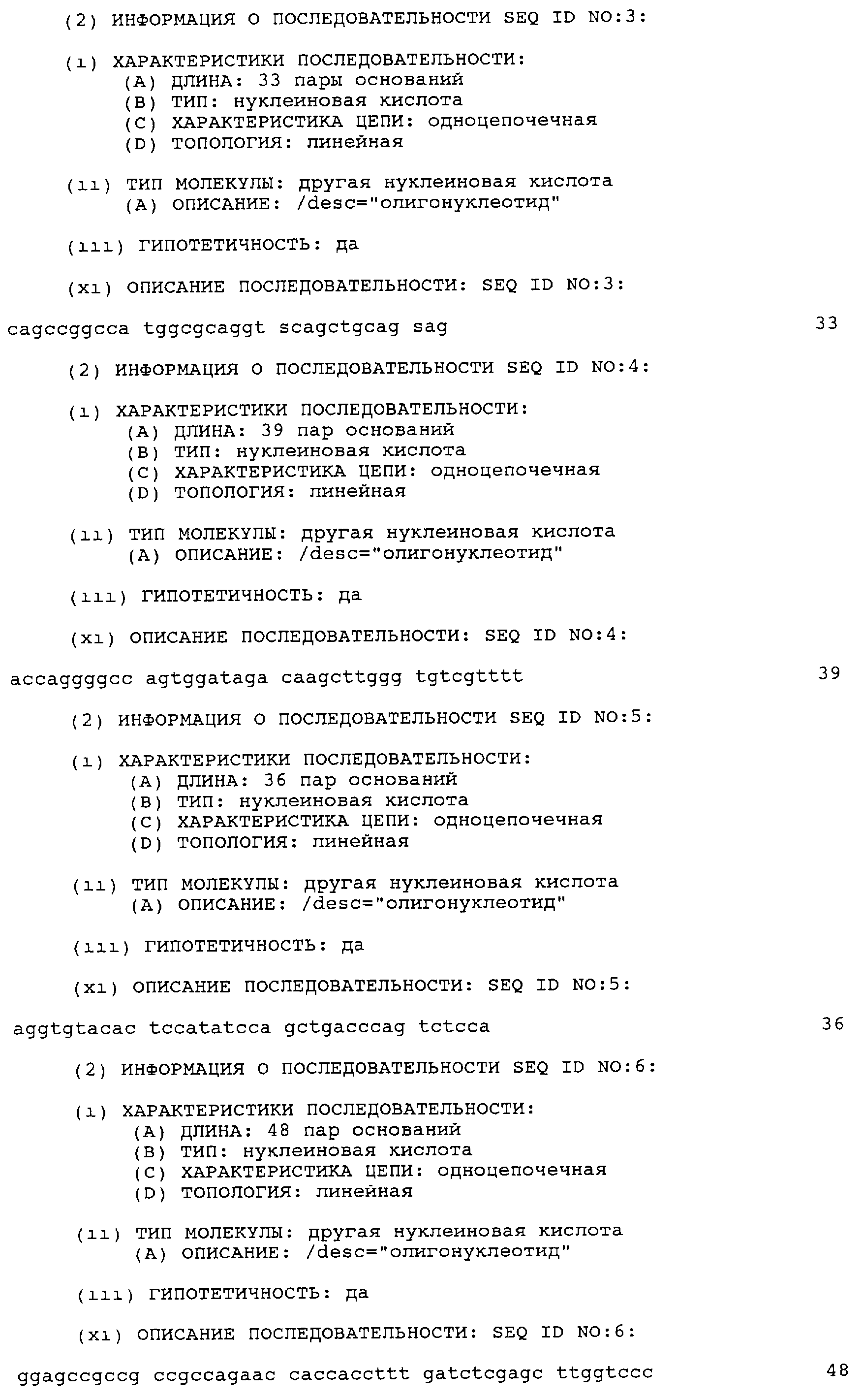 Кроме того, в зависимости от используемой системы экспрессии, лидерные последовательности, которые обладают способностью осуществлять направленный перенос полипептида в клеточный компартмент или обеспечивать направленную секрецию в среду, могут быть добавлены к кодирующей последовательности полинуклеотида по изобретению, и они хорошо известны в данной области; см., например, приведенные ниже примеры. Лидерную(ые) последовательность(и) объединяют на соответствующей фазе с последовательностями трансляции, инициации и терминации, и предпочтительная лидерная последовательность обладает способностью обеспечивать направленную секрецию транслируемого протеина или его части в периплазматическое пространство или внеклеточную среду. Необязательно гетерологичная последовательность может кодировать слитый протеин, который включает N-концевой идентифицирующий пептид, придающий требуемые характеристики, например, осуществляющий стабилизирующую функцию или упрощающий очистку экспрессируемого рекомбинантного продукта; см. выше. В этом контексте приемлемыми экспрессионными векторами являются известные в данной области векторы, такие как экспрессионный вектор кДНК Okayama-Berg (Окаяма-Берга) pcDV1 (фирма Pharmacia), pCDM8, pRc/CMV, pcDNA1, pcDNA3 (фирма In-vitrogen) или pSPORT1 (фирма GIBCO BRL).