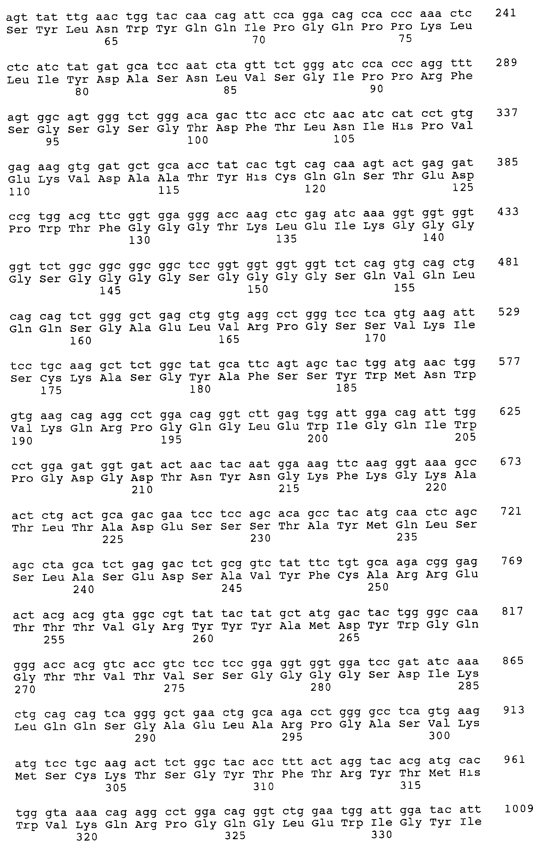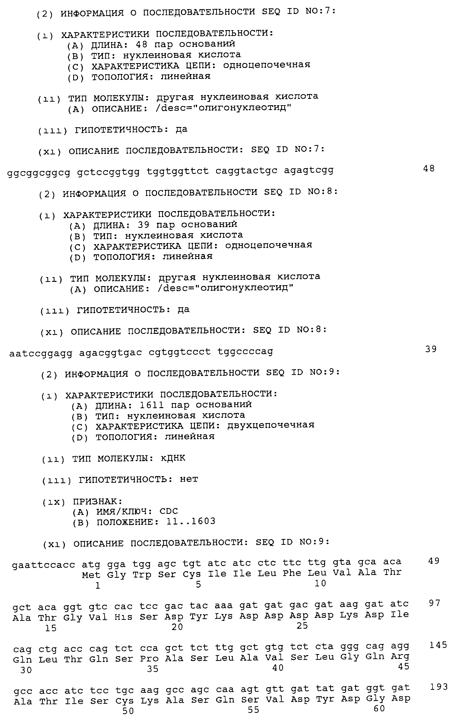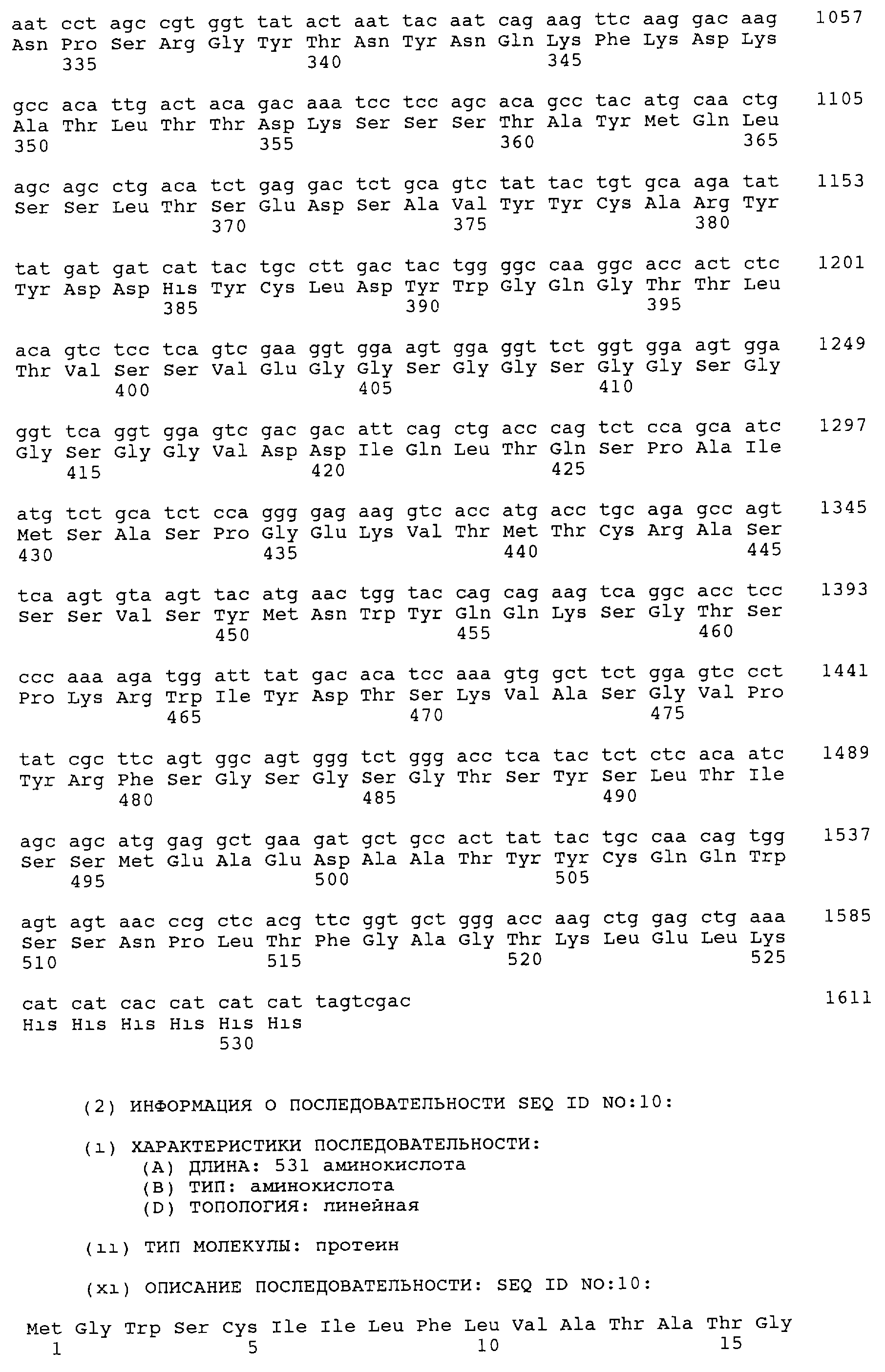 Согласно еще одному предпочтительному варианту осуществления изобретения, первый домен полипептида по изобретению включает по меньшей мере один CDR VH– и VL-области, который имеет аминокислотную последовательность, кодируемую последовательностью ДНК, представленной на фиг.8 от нуклеотида 82 до 414 (VL) и от нуклеотида 460 до 831 (VH), и/или второй домен включает по меньшей мере один CDR, более предпочтительно два, еще более три CDR VH– и VL-области, который(е) имеет(ют) аминокислотную последовательность, кодируемую последовательностью ДНК, представленной на фиг.8 от нуклеотида 847 до 1203 (VH) и от нуклеотида 1258 до 1575 (VL), необязательно в комбинации с каркасными участками, которые встречаются вместе в этих CDR в родительских антителах. CDR, содержащие указанные на фиг.8 вариабельные области, могут быть выявлены, например, согласно Кэбату, Kabat, “Sequences of Proteins of Immunological Interest” (U.S. Department of Health and Human Services, 3-е изд. 1983 г; 4-е изд. 1987 г.; 5-е изд. 1990 г.). Специалисту в данной области должно быть очевидно, что антигенсвязывающий участок или по меньший мере один полученный из него CDR может применяться для конструирования полипептида по изобретению. Предпочтительно этот полипептид включает аминокислотную последовательность, кодируемую последовательностью ДНК, представленной на фиг.8 от нуклеотида 82 по 1575. Специалисту в данной области должно быть очевидно, что антигенсвязывающие участки полипептида по изобретению могут быть сконструированы с помощью методов, известных в данной области, например описанных в ЕР-А10451261 и ЕР-А10549581.