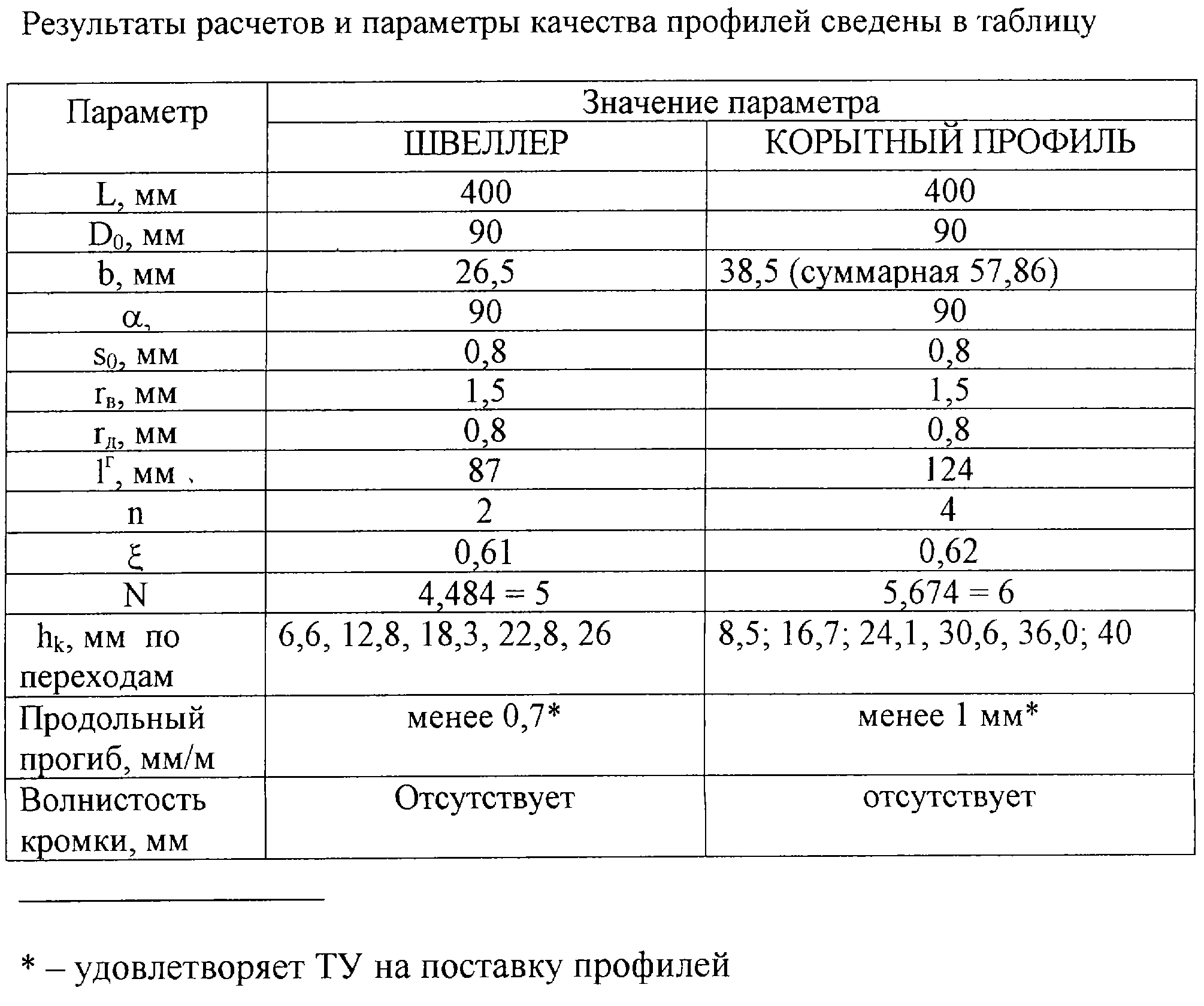 По предлагаемому способу изготавливали швеллерный профиль размером 90 28 0,8 мм и корытный профиль размером 90 40 20 0,8 мм из оцинкованной стали с радиусами гиба 1,5 мм, суммарными углами подгибки 90 градусов на шестиклетьевом станке ГПС-300М6 с диаметром рабочих валов 50 мм и межклетьевым расстоянием 400 мм при скорости профилирования 12 м/мин. Результаты расчетов и параметры качества профилей сведены в таблицу.