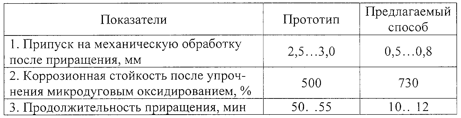 Как видно из таблицы, предлагаемый способ восстановления привалочных плоскостей головок цилиндров автотракторных двигателей из алюминиевых сплавов позволяет более чем в 3 раза уменьшить припуск на их механическую обработку и увеличить коррозионную стойкость этих плоскостей на 46%. Продолжительность приращения при этом сократилась не менее чем в 4,5 раза, тем самым увеличив производительность при восстановлении привалочных плоскостей головок цилиндров автотракторных двигателей.