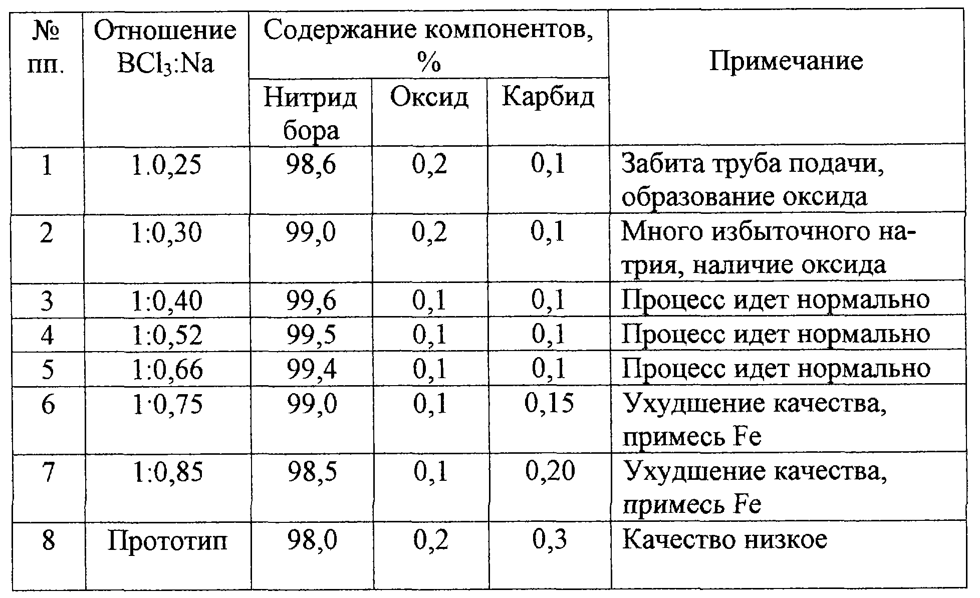 Следует отметить, что при соотношении ВСl3:Nа от 1:0,4 до 1:0,66 (при избытке натрия) обеспечивается синтез нитрида бора повышенного качества. Наличие избыточного натрия способствует образованию нитрида натрия, и, следовательно, интенсифицируется получение нитрида бора стехиометрического состава за счет выделения атомарного азота. Использование для последующего восстановления хлорида бора оборотного конденсата, содержащего хлорид натрия и избыточный натрий, позволяет утилизировать последний, улучшить качество нитрида и интенсифицировать синтез.