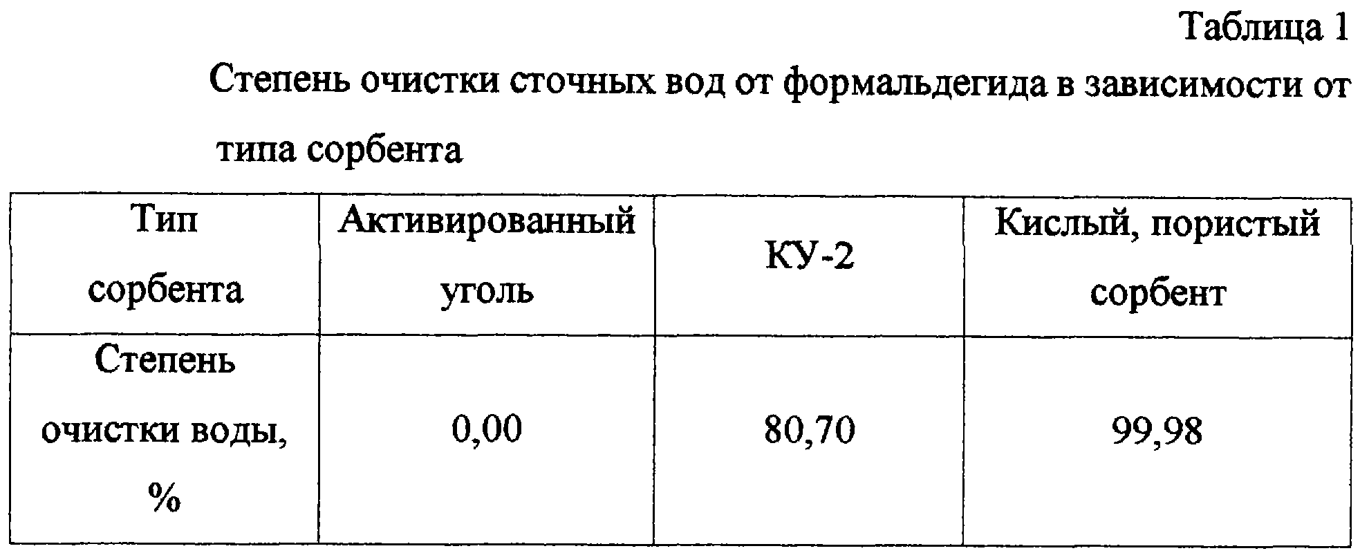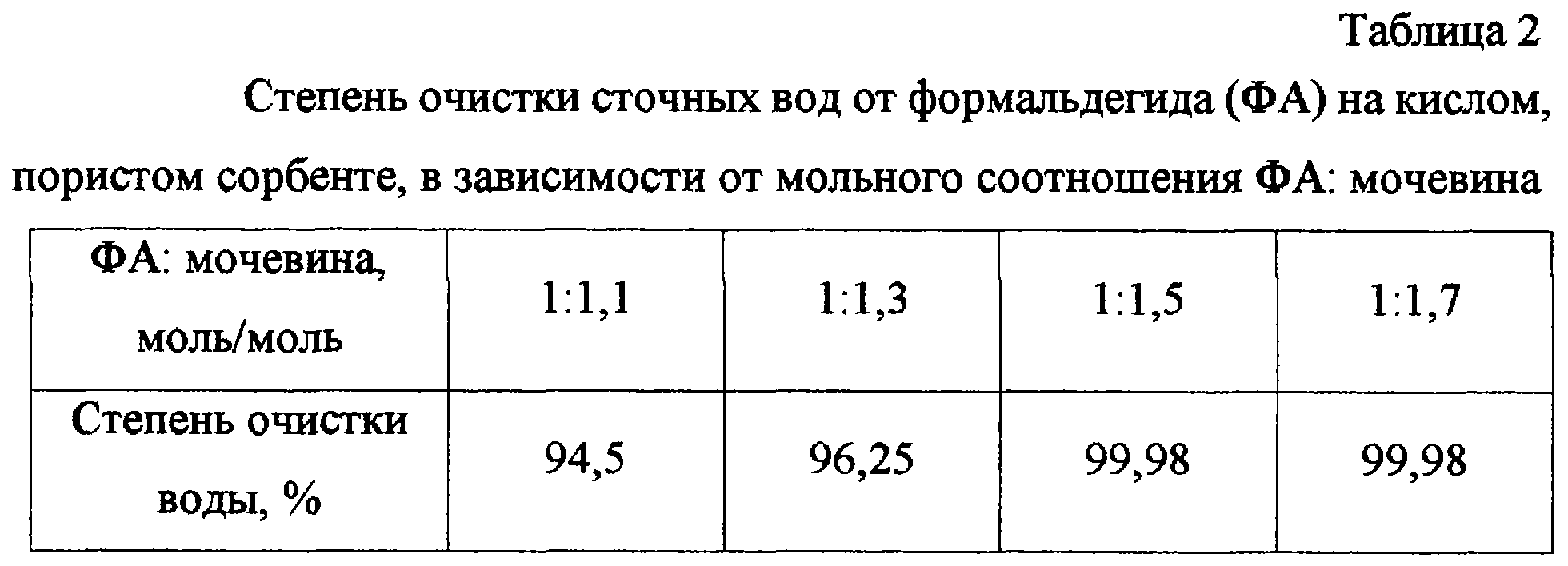 Приготовлены по одному литру четыре образца нейтральной сточной воды, содержащей формальдегид с концентрацией 3 г/л с мочевиной, в мольном соотношении формальдегид: мочевина от 1:1,1 до 1:1,7. В полученные образцы вводят по 30 г кислого пористого сорбента, выдерживают 10 мин, после чего определяют степень очистки формальдегида.