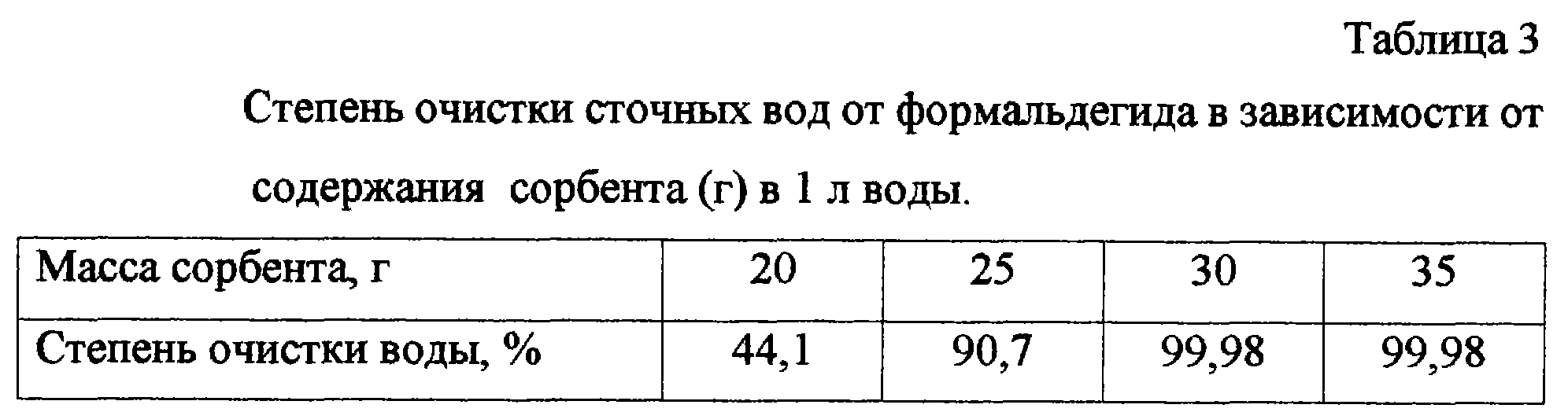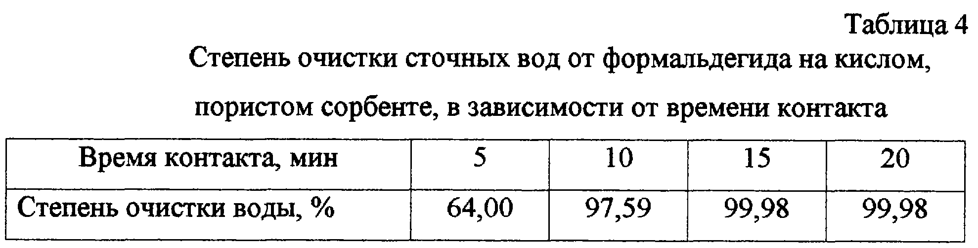 Приготовлены по одному литру четыре образца нейтральной сточной воды, содержащей формальдегид с концентрацией 3 г/л с мочевиной, в мольном соотношении формальдегид: мочевина 1:1,5, с содержанием кислого пористого сорбента по 30 г в каждом, выдерживают соответственно 5-20 мин.
