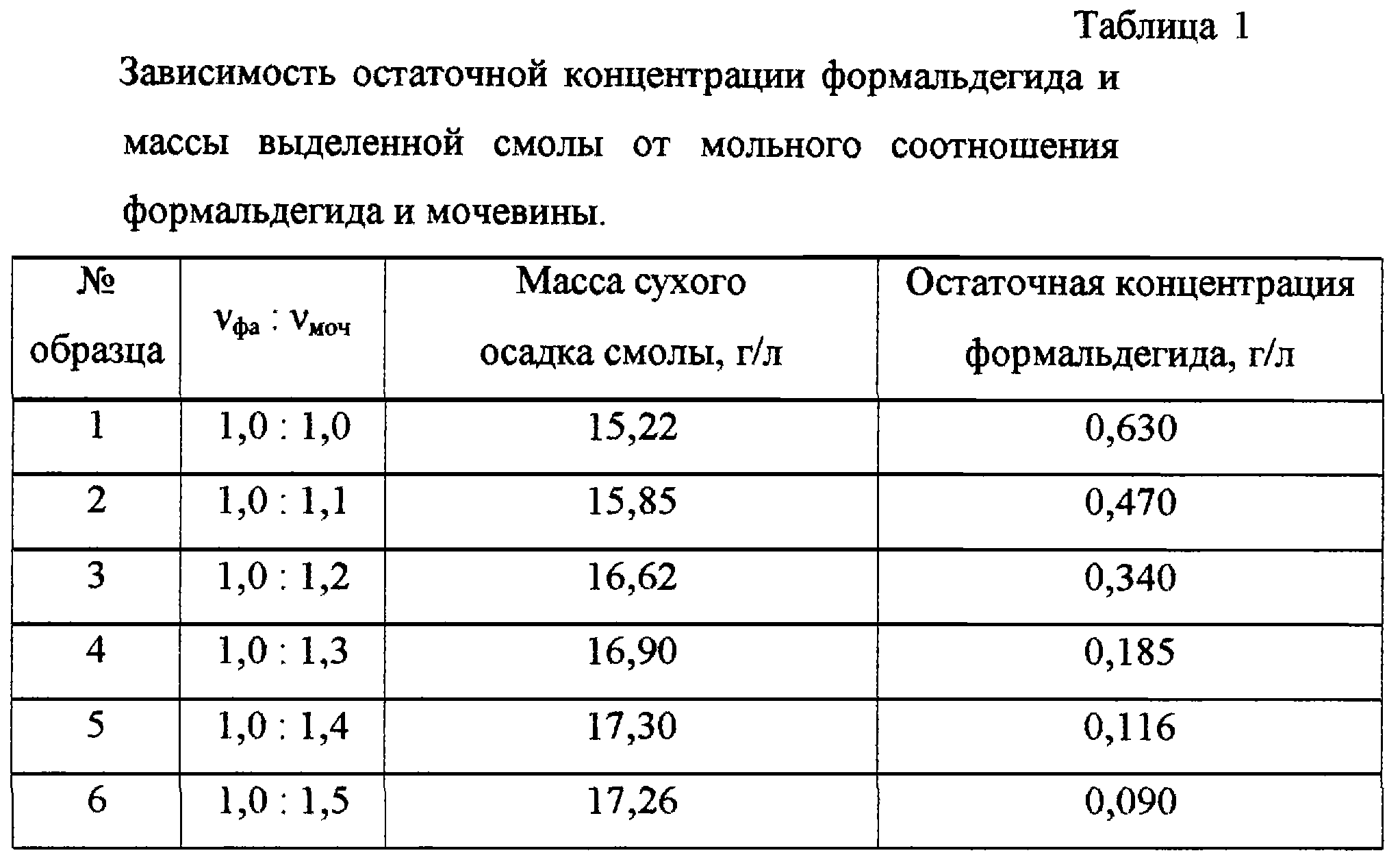 В семь образцов производственных сточных вод объемом 1000 мл каждый с концентрацией формальдегида 3,0 г/л различной кислотности (рН от 1,0 до 4,0) соответственно вносят мочевину из мольного соотношения формальдегид : мочевина, равное 1,0:1,5, и выдерживают от 0,5 до 5 ч.