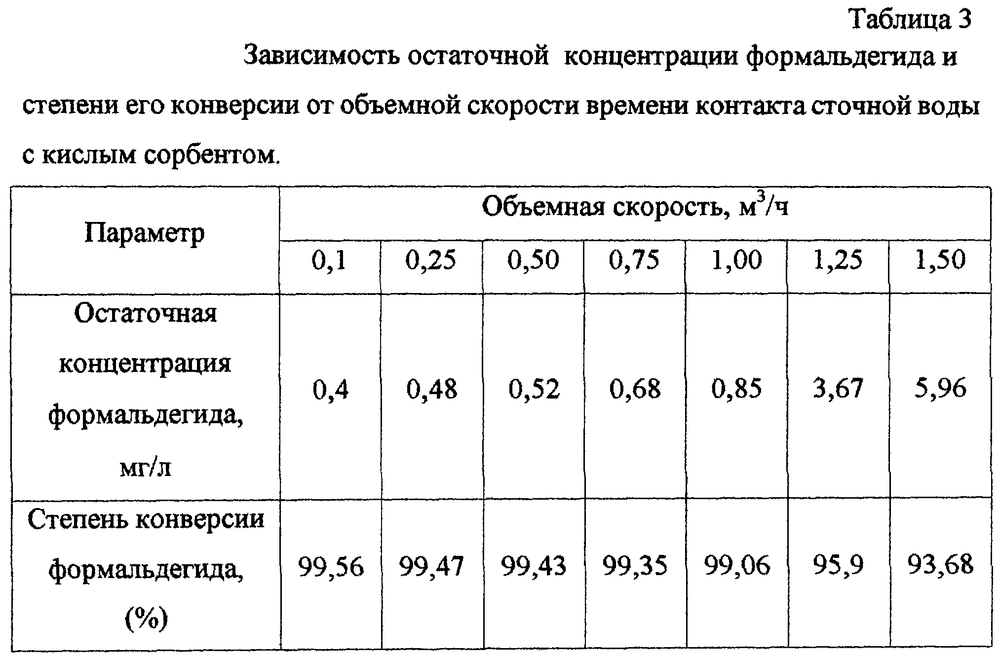 Очищенную сточную воду, с остаточной концентрацией формальдегида 90 мг/л, после удаления смолы фильтрацией, пропускают через пористый кислый сорбент с объемной скоростью в интервале 0,1-1,0 м3/ч.