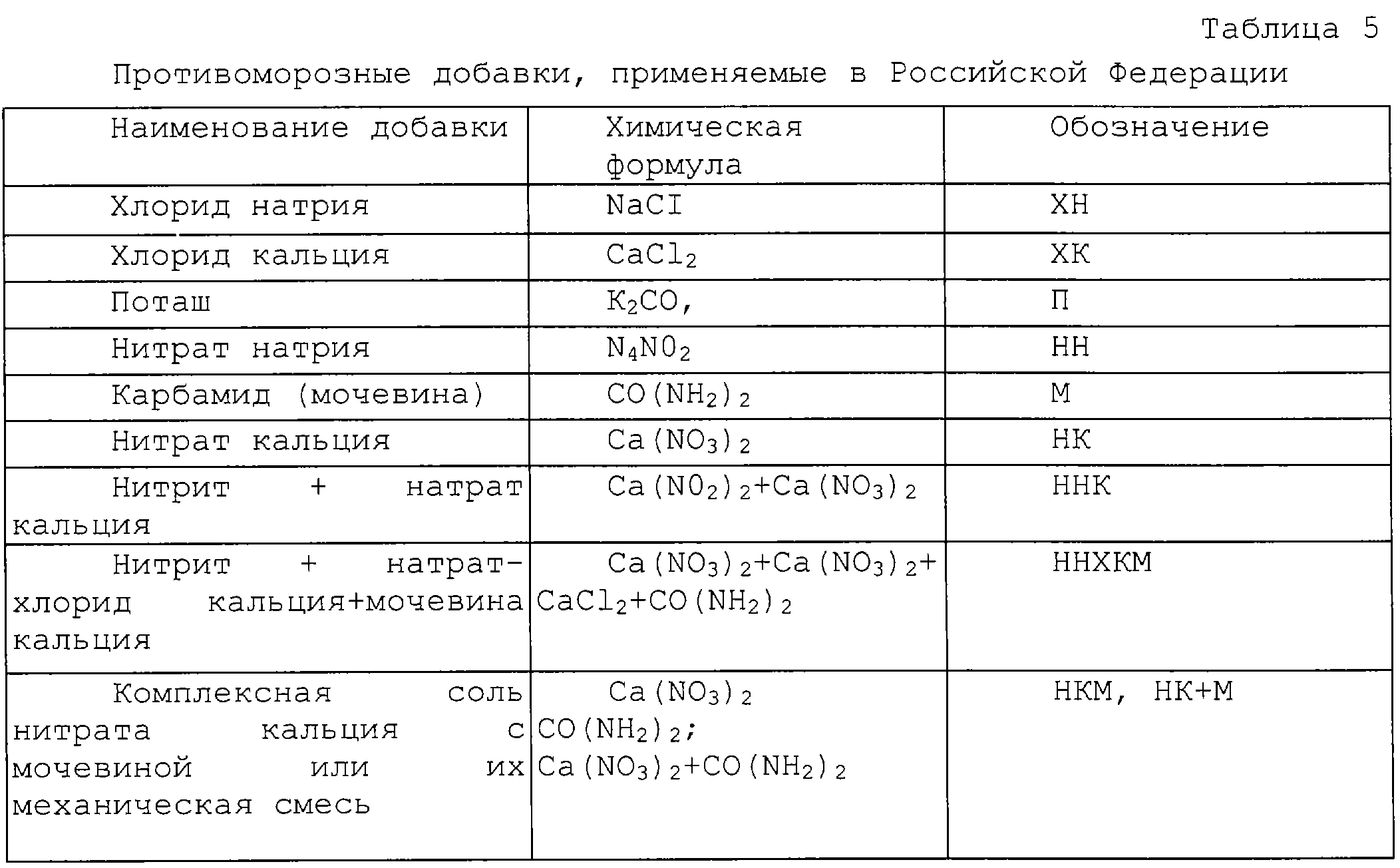 (57) Реферат: Изобретение относится к способам приготовления бетонных смесей для сборных и монолитных изделий и конструкций. В способе приготовления бетонной смеси, включающем предварительное перемешивание части воды затворения, песка и добавки с последующим введением цемента, дополнительным перемешиванием и добавлением остальной части воды затворения, причем при приготовлении бетонной смеси вводят крупный заполнитель-щебень, в качестве добавки используют раствор природного минерала бишофита MgCl2·6H2O сульфатного типа, плотностью 1,24-1,35 т/м3 с молекулярной массой 203,303 в количестве 2-12% от массы цемента, предварительное перемешивание осуществляют с 30-70 мас.% воды затворения и 1/2 – 1/4 частью песка в течение 2-5 минут, а оставшийся песок и щебень вводят при дополнительном перемешивании. Технический результат – снижение себестоимости бетона, повышение прочности при зимнем бетонировании. 8 табл. Изобретение относится к способам приготовления бетонных смесей для сборных и монолитных изделий и конструкций. Известен способ приготовления бетонной смеси, включающий смешивание в турбулентном смесителе воды, цемента, песка с последующим смешиванием полученной активированной смеси с крупным заполнителем в низкоскоростном смесителе, в котором с целью экономии цемента, снижения энергозатрат в турбулентный смеситель подают последовательно с интервалом 20 с воду, песок в количестве 25-50% от общей массы песка, цемент и перемешивают в течение 40-60 с, затем полученную активированную смесь смешивают в течение 50-60 с в низкоскоростном смесителе с предварительно перемешанными в течение 20-25 с с крупным заполнителем и оставшейся частью песка (SU авторское свидетельство №1645264 А1, М.кл.5 Одним из методов зимнего бетонирования является применение бетонов, твердеющих на морозе. Для обеспечения твердения бетона в зимних условиях необходимо предотвратить замерзание его твердой фазы, т.е. в твердеющем на морозе бетоне нужно сохранять положительную температуру (подогрев) до набора этим бетоном определенной прочности или искусственно понизить температуру замерзания жидкой фазы. Однако описанный выше способ приготовления бетонной смеси не предусматривает добавок для затворения бетонных смесей водных растворов, содержащих химические вещества (противоморозные добавки), понижающие температуру замерзания жидкой фазы. Противоморозные добавки нашли широкое применение при возведении монолитных и сборно-монолитных бетонных и железобетонных конструкций и сооружений, монолитных частей сборно-монолитных конструкций, включая бетонирование в скользящей опалубке, для замоноличивания стыков сборных бетонных и железобетонных конструкций в условиях строительных площадок и полигонов при установившейся температуре наружного воздуха или грунта ниже +5°С и минимальной суточной температуре ниже 0°С вплоть до -30°С. Наиболее близким аналогом к заявленному объекту относится способ приготовления бетонной смеси, включающий предварительное перемешивание песка, щебня, части воды затворения и добавки с последующим введением цемента, дополнительным перемешиванием и добавлением остальной части воды затворения, в котором в качестве добавки используют 40-45%-ный водный раствор формиатно-спиртового пластификатора, представляющего собой побочный продукт производст