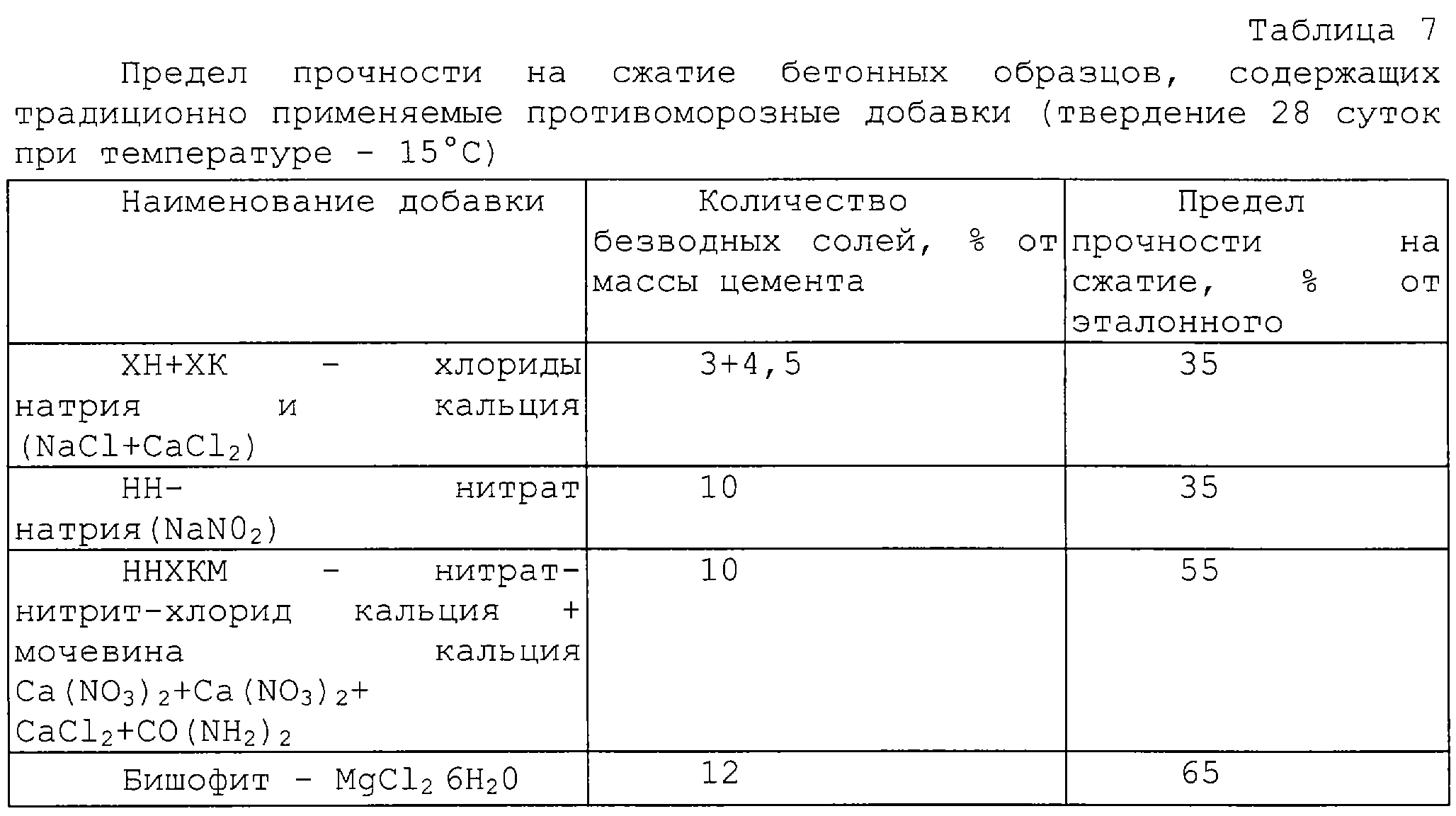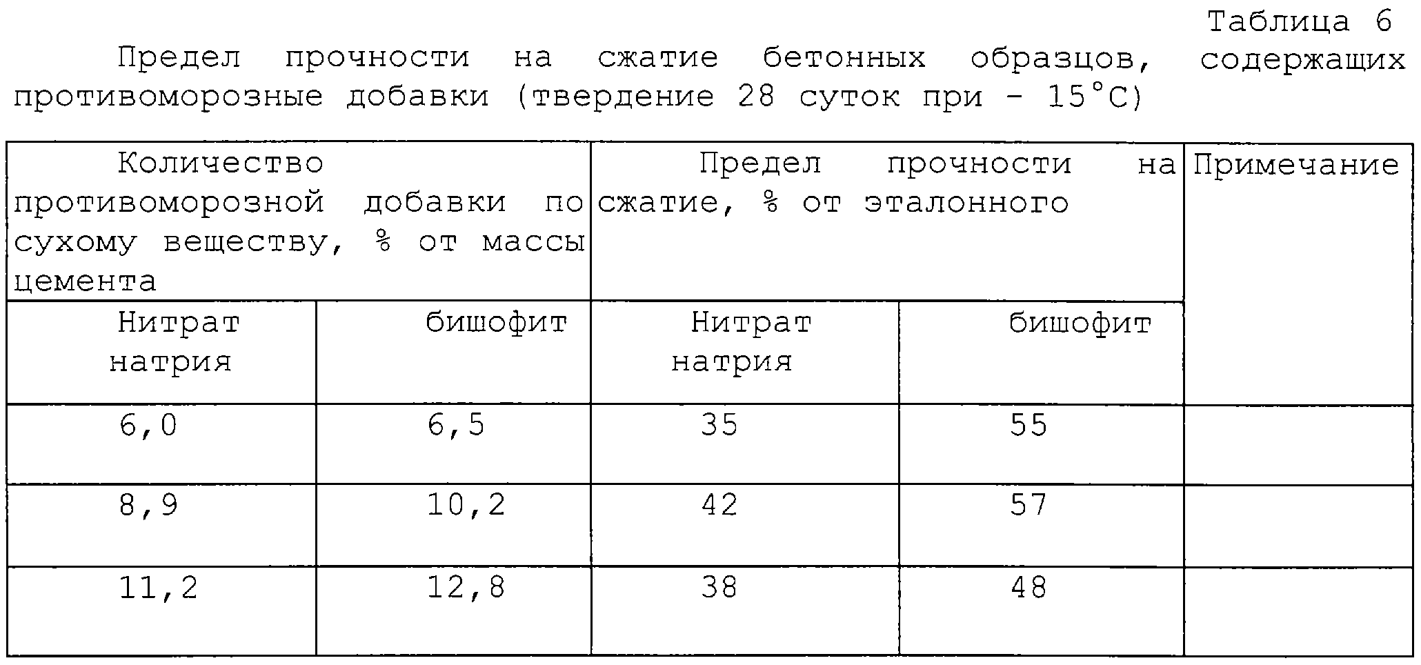 Проведенные к настоящему времени научно-исследовательские и экспериментальные работы по определению возможности применения бишофита, по сравнению с другими противоморозными добавками, применяемыми в Российской Федерации (марки и обозначения последних приведены в табл. 5), показали, что раствор (рассол) природного минерала бишофита является высокоэффективной противоморозной добавкой, позволяющей проводить работы по зимнему бетонированию при температурах воздуха до минус 20°С. Температура замерзания бишофита 45-50°С. Результаты измерения прочности на сжатие бетонных образцов, твердеющих при -15°С в течение 28 суток, представлены в табл. 6. Поскольку противоморозные добавки выполняют свои функции прежде всего за счет снижения ими температуры замерзания воды, то наиболее обоснованно и правильно назначать их дозировку к массе воды затворения, а не к массе портландцемента. В проведенных нами исследованиях в качестве воды затворения применялись растворы бишофита в количестве 10-24% к массе воды. Для сравнения в табл. 7 приведены данные по набору прочности бетона при применении традиционных противоморозных добавок бишофита. Как показывает сравнение приведенных в табл. 6 и 7 данных, присутствие полученной природной противоморозной добавки обеспечивает сравнительно интенсивное твердение бетона при температурах до -15°С.