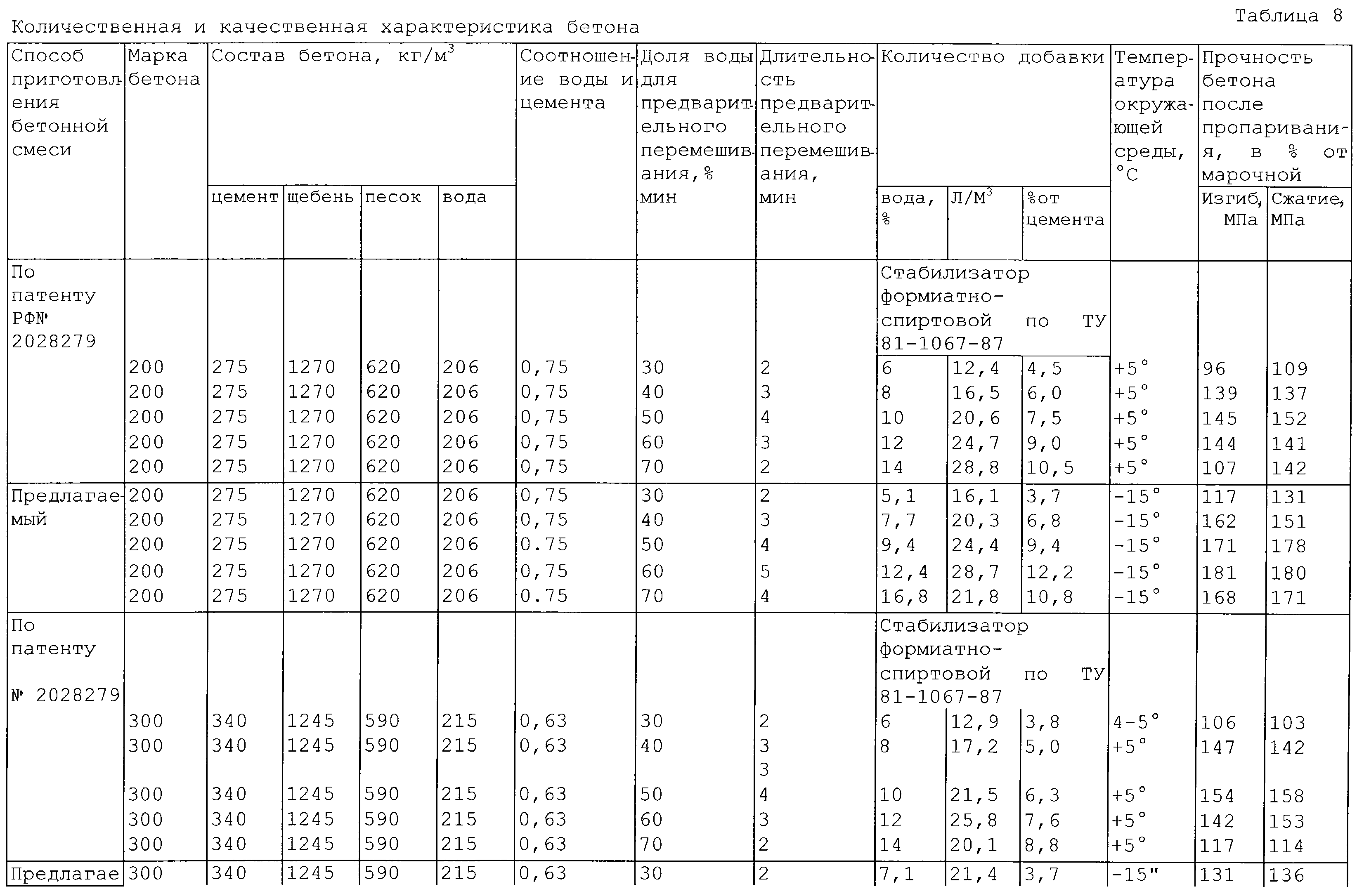 Сравнительные результаты испытаний бетонов марок 200 и 300 представлены в табл. 8. При энергоемкости процесса приготовления бетона в пределах 3 кВт/ч на 1 т бетона и равном расходе цемента марки 500 прочность бетона возрастает на 15-25% при зимнем бетонировании.