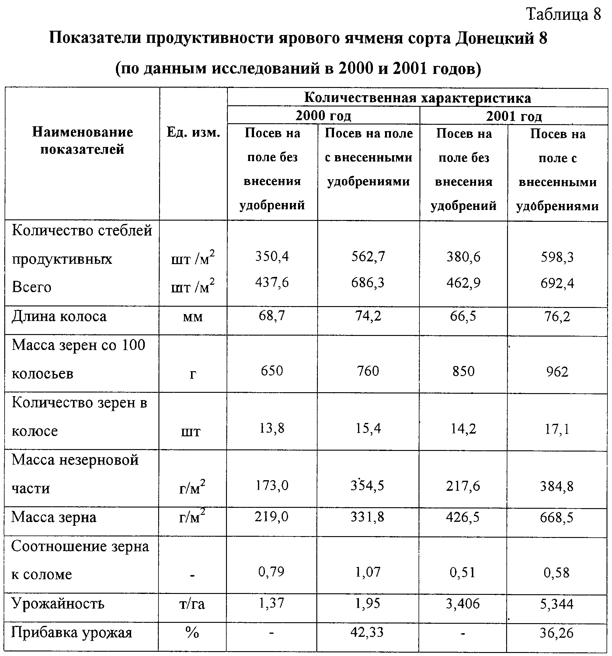 Вносимые элементы питания в почву с 10 т предлагаемого удобрения показано в таблице 6. Химический анализ удобрения представлен в таблице 7. Эффективность предложенного удобрения проверено в хозяйствах Волгоградской области в период с 1999 по 2001 годы. При возделывании ярового ячменя сорта Донецкий 8 в условиях Даниловского района (см. таблицу 8) и Михайловского района Волгоградской области прибавка урожая составляет 36-42%. При этом следует отметить, что на полях с внесенными удобрениями не снизилось содержание гумуса. Этому способствуют волокнистые материалы шрота корней и корневищ солодки голой и солодки уральской.