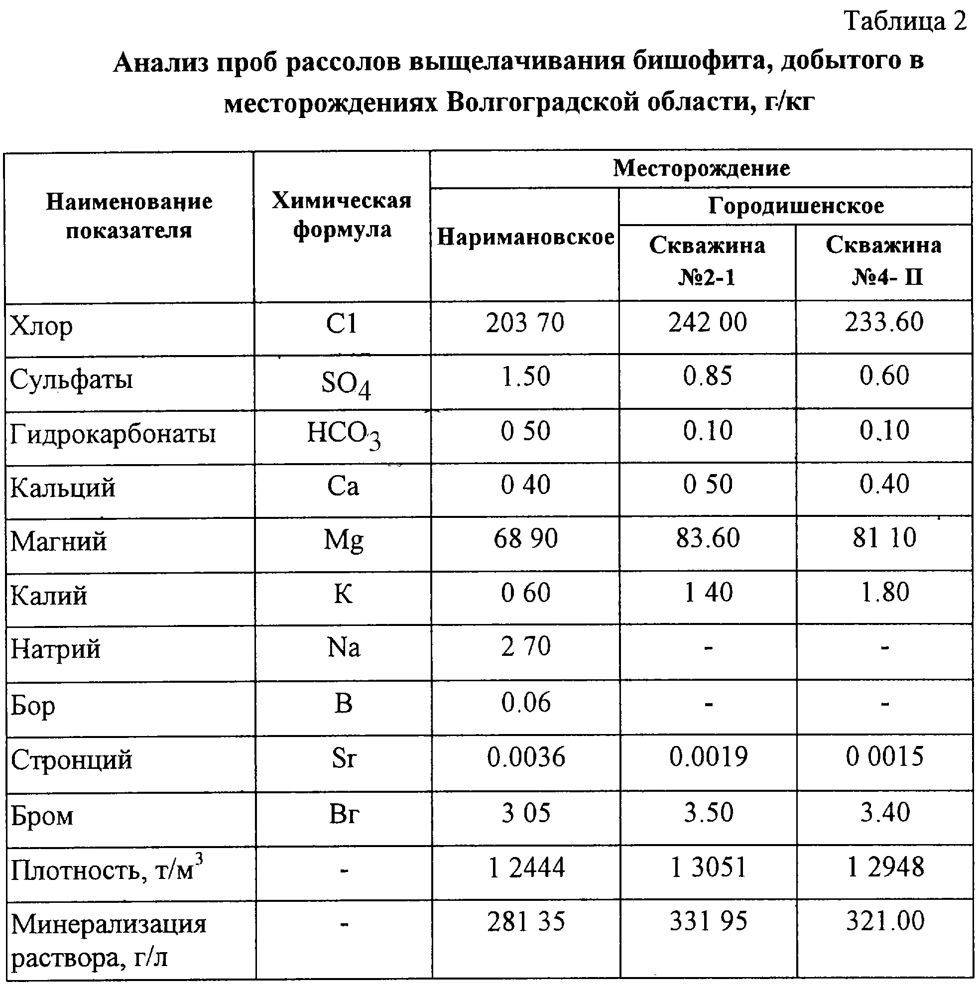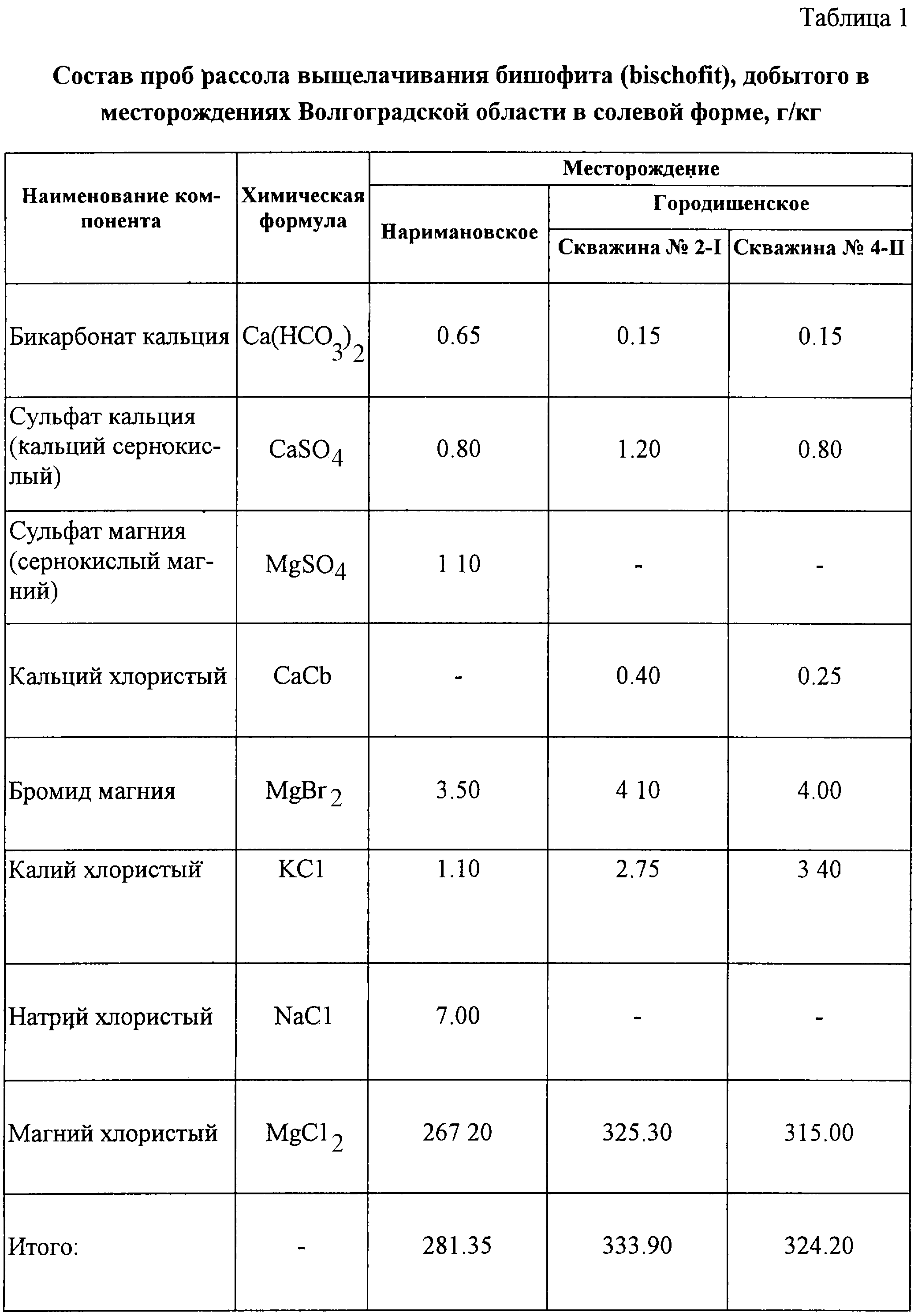 Описанные компоненты механически измельчают на дробилках для получения требуемых размеров в каждой фракции. Инородные примеси, такие как камни, куски кирпичей, древесные включения, куски шифера и толя, вязальной проволоки и шпагата, металлические детали от навозного транспортера, доильных и других установок удаляют посредством решетного стана и магнитного уловителя. Измельченные фракции сначала сепарируют, а затем интенсивно перемешивают, добиваясь однородной смеси. Для обеззараживания компонентов органического удобрения от патогенных микроорганизмов вносят от 100 до 200 л рассола природного минерала бишофит сульфатного типа формулы MgCl2·6H2O плотностью 1,20-1,40 т/м3 на каждую тонну смеси органики. Смесь интенсивно перемешивают. Состав проб рассола выщелачивания бишофита (bischofit), добытого в месторождениях Волгоградской области в солевой форме приведен в таблице 1.