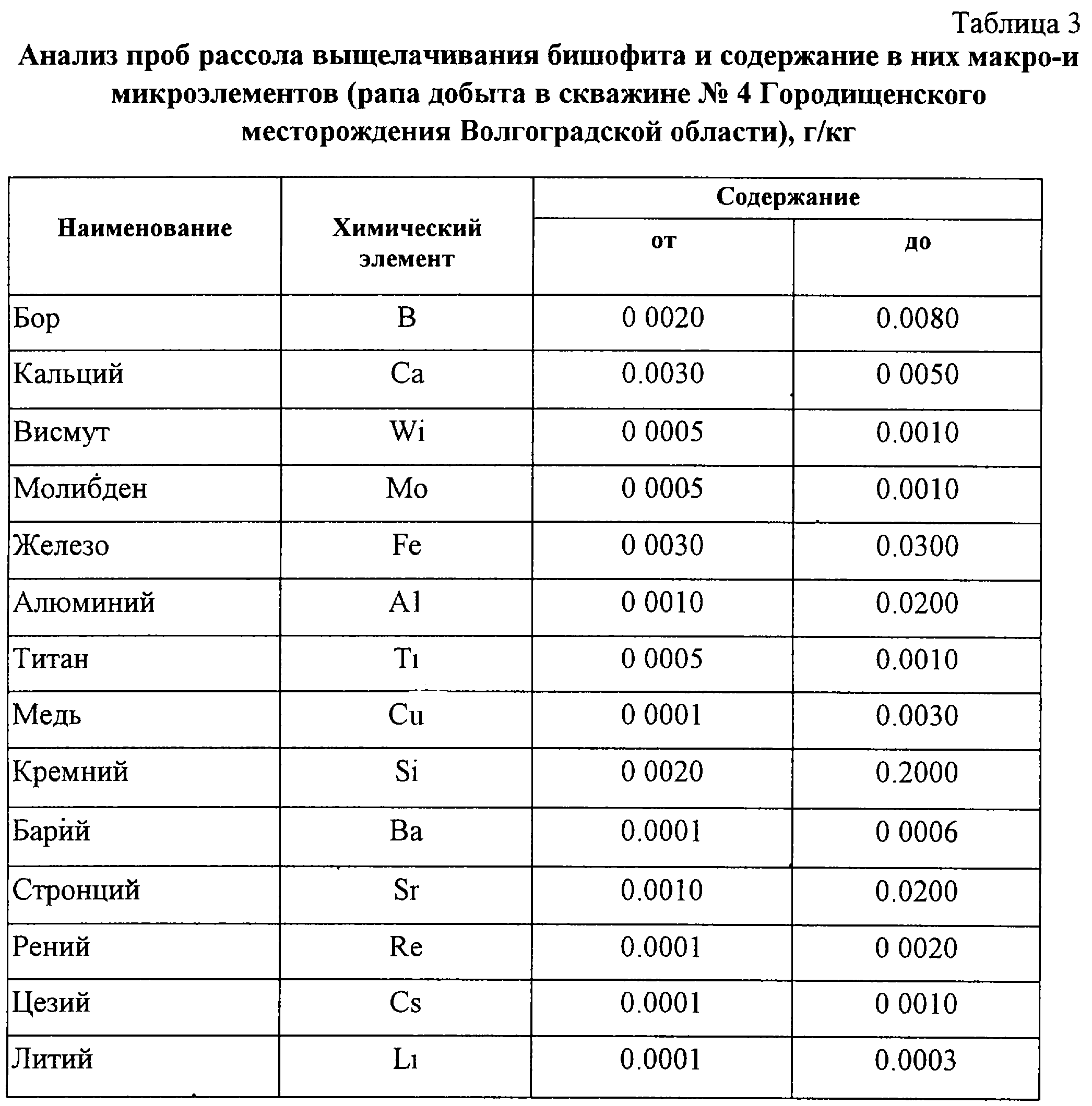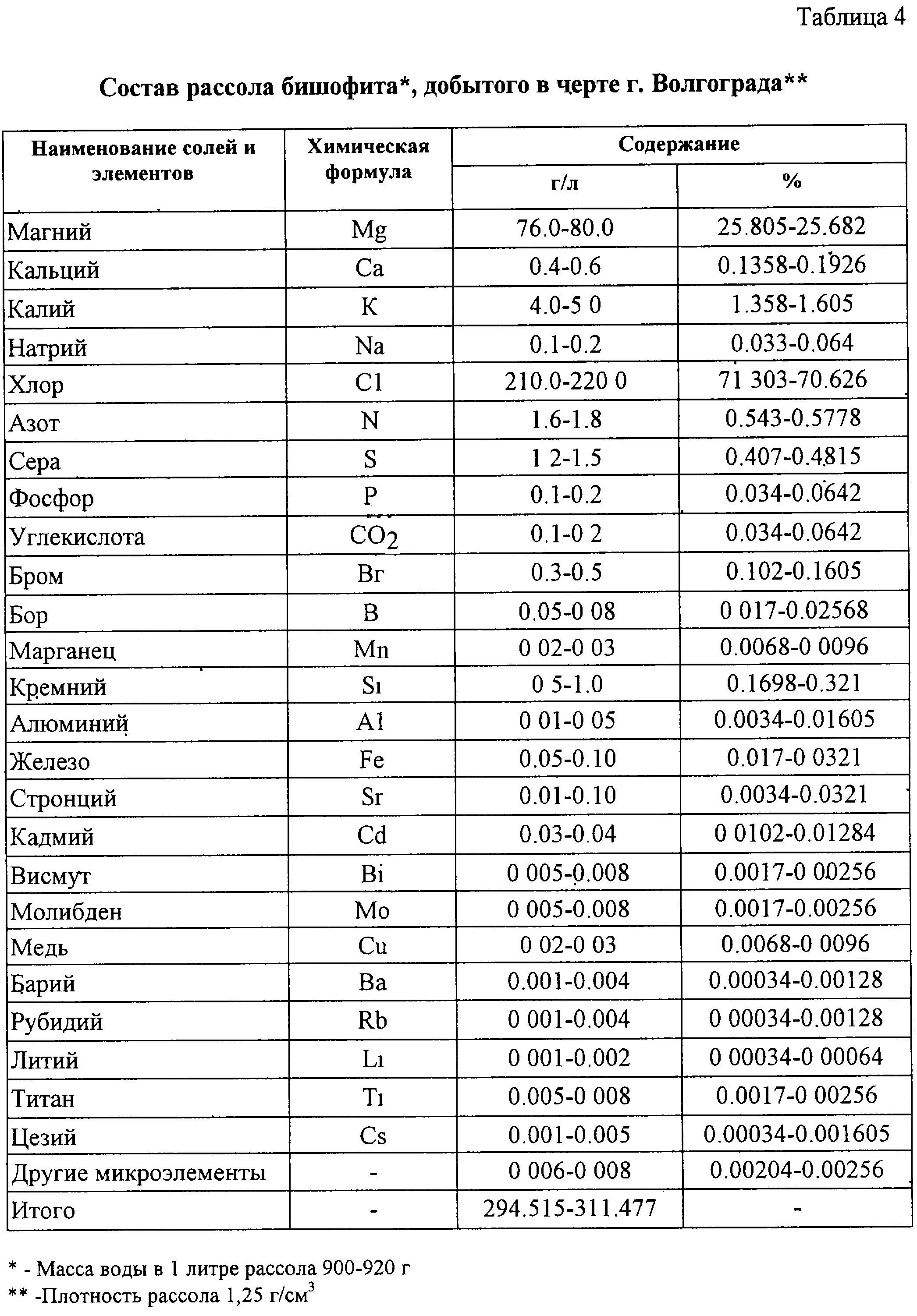 Анализ проб рассолов выщелачивания бишофита с уровнем минерализации от 280 до 340 г/л показан в таблице 2. Содержание макро- и микроэлементов в рассоле бишофита приведено в таблице 3. Состав рассола бишофита добытого в черте г. Волгограда представлен в таблице 4.