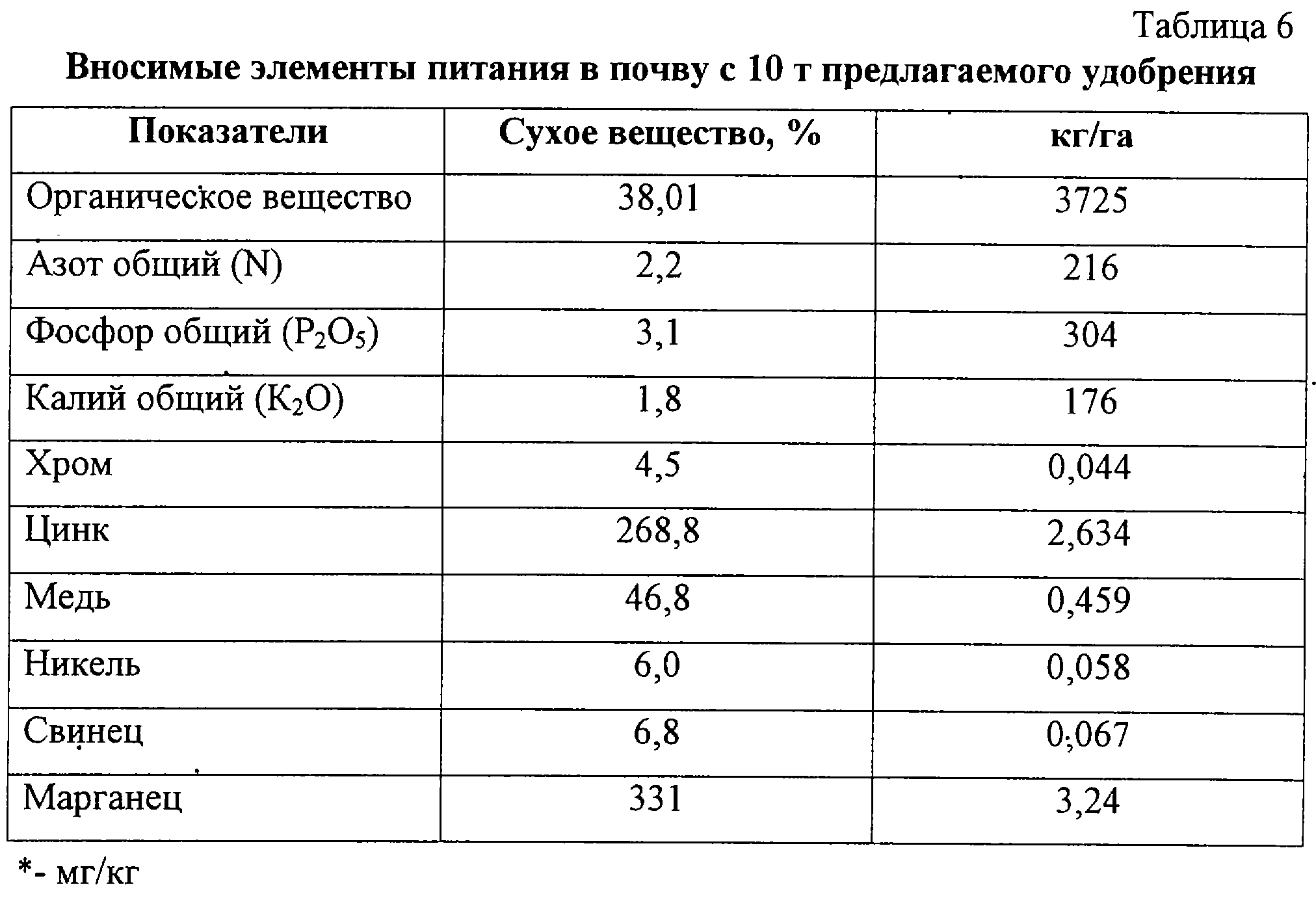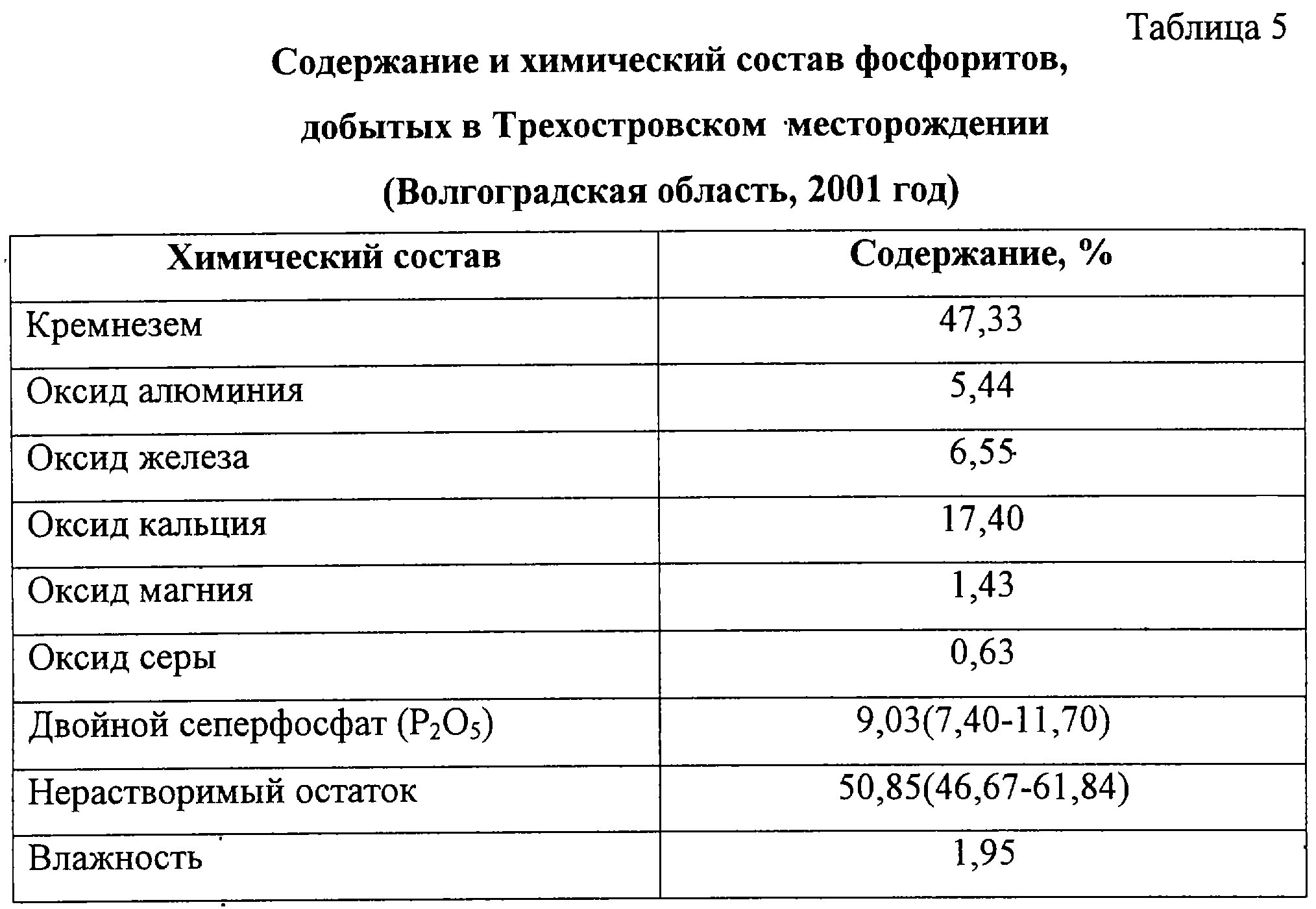 Приведенные данные свидетельствуют о том, что в компонентах получаемого удобрения уничтожаются не только патогены, но и оно насыщается микроэлементами. При этом последние находятся в усвояемой форме для всех видов растений. Хлористый магний MgCl2 обеспечивает нейтрализацию смеси до рН 6,2-6,6 среды и способствует сохранению всех органических соединений, являющихся носителями азота в удобрении. Смесь высушивают до влажности 16-22%. В нее вводят шрот корней и корневищ солодки голой и размолотые фосфаты влажность 1,5-4,5% при интенсивном смешивании. Запасы фосфоритов в Волгоградской области геологами оцениваются миллиардами тонн. Наибольшие запасы фосфоритов расположены вблизи г.Камышин Волгоградской области и р.п. Иловля в Иловлинском районе. Химический состав фосфоритов, добытых в Трехостровском месторождении приведен в таблице 5. Содержание двойного суперфосфата (P2O5) колеблется от 7,40 до 11,70%.