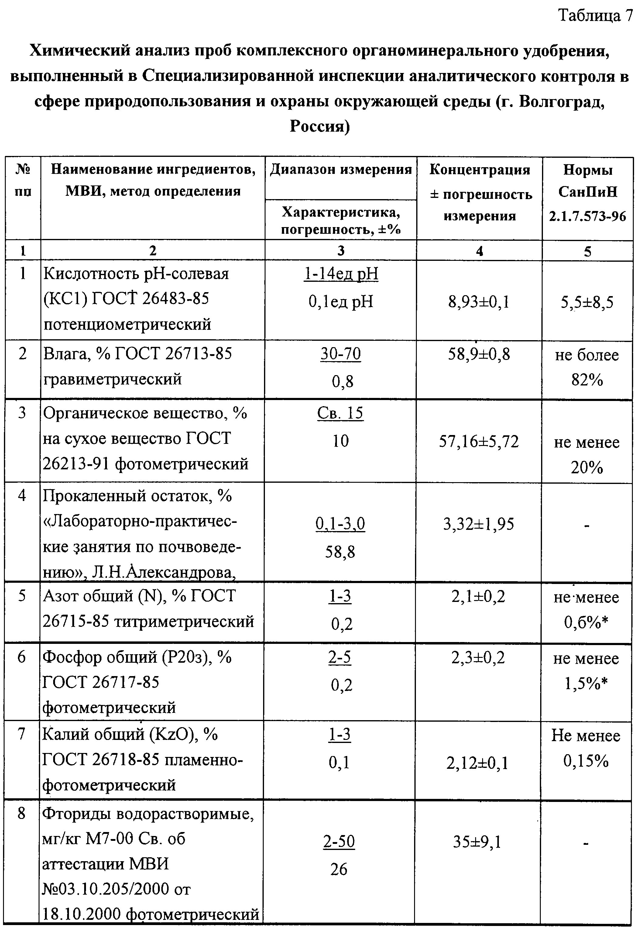 (57) Реферат: Изобретение относится к сельскому хозяйству и может быть использовано при производстве органических удобрений для подкормки минеральным питанием сельскохозяйственных культур при возделывании в орошаемом и неорошаемом земледелии с заданной продуктивностью. Способ включает обработку выделений животных и их нейтрализацию. Птичий помет двухлетнего разложения, выделения свиней четырехлетнего разложения, подстилку и выделения крупного рогатого скота двухлетнего разложения измельчают на фракции и сепарируют. Измельченные фракции перемешивают со шротом корней и корневищ солодки при переработке на густой и сухой экстракты. Затем смесь обеззараживают от патогенных микроорганизмов рассолом бишофита из расчета 100-200 л плотностью 1,2-1,4 т/м3 на каждую тонну. Смесь высушивают до влажности 16-22%. В эту смесь при интенсивном смешивании вводят размолотые фосфориты влажностью 1,5-4,5%. Изобретение позволяет снизить себестоимость удобрений при высоком содержании в них всех доступных и усвояемых элементов. 1 з.п. ф-лы, 8 табл. Изобретение относится к способам производства органических удобрений с использованием отходов производства экстрактов из корня солодки, продуктов разложения выделений животных, природных минеральных ресурсов в виде фосфоритов и рассола минерала бишофита для подкормки минеральным питанием сельскохозяйственных культур при возделывании с заданной продуктивностью. Известен способ приготовления органического удобрения и корма из птичьего помета, в котором с целью снижения затрат на обезвоживание материала и снижения расхода едкого калия птичий помет нагревают и частично обезвоживают в потоке газообразного теплоносителя, вводят в него безводные фосфаты, а перед пропусканием газов и паров воды через слой едкого калия последние подвергают конденсации; в качестве газообразного теплоносителя используют воздух, подогретый до 310-350К, который пропускают со скоростью 1,5-3,5 м/с; безводные фосфаты вводят в количестве 5-15% от массы помета (SU, авторское свидетельство 627111, М.кл3 К недостаткам этого способа приготовления удобрения относятся его высокая себестоимость и отсутствие в нем микроэлементов. Высокая себестоимость каждой тонны удобрений продиктована потребностью сложной и дорогостоящей установки и энергоносителей. Это удобрение из птичьего помета имеет небольшое применение в сельском хозяйстве. Известен также способ получения удобрения из твердой фракции свиного навоза, торфа и минеральной добавки, в котором с целью улучшения физико-химических свойств твердую фракцию свиного навоза влажностью 70-82% в количестве 47-57% предварительно обрабатывают 35-37%-ным раствором формальдегида в количестве 3-5% от сухой массы свиного навоза, смешивают с торфом в количестве 31,1-41,1% и минеральной добавкой в количестве 10-20%, затем всю смесь обрабатывают 20-ной аммиачной водой, после чего массу влажностью 53-63% гранулируют и высушивают (SU, авторское свидетельство 844614, М.кл3 К недостаткам этого удобрения относятся высокая стоимость, большие затраты энергии и труда, а также низкое содержание в производимом удобрении основных минеральных компонентов питания (N, Р, К), необходимых для подрастания и формирования урожая сельскохозяйственных культур. Известен также способ получения гранулированного минерального удобрения путем 