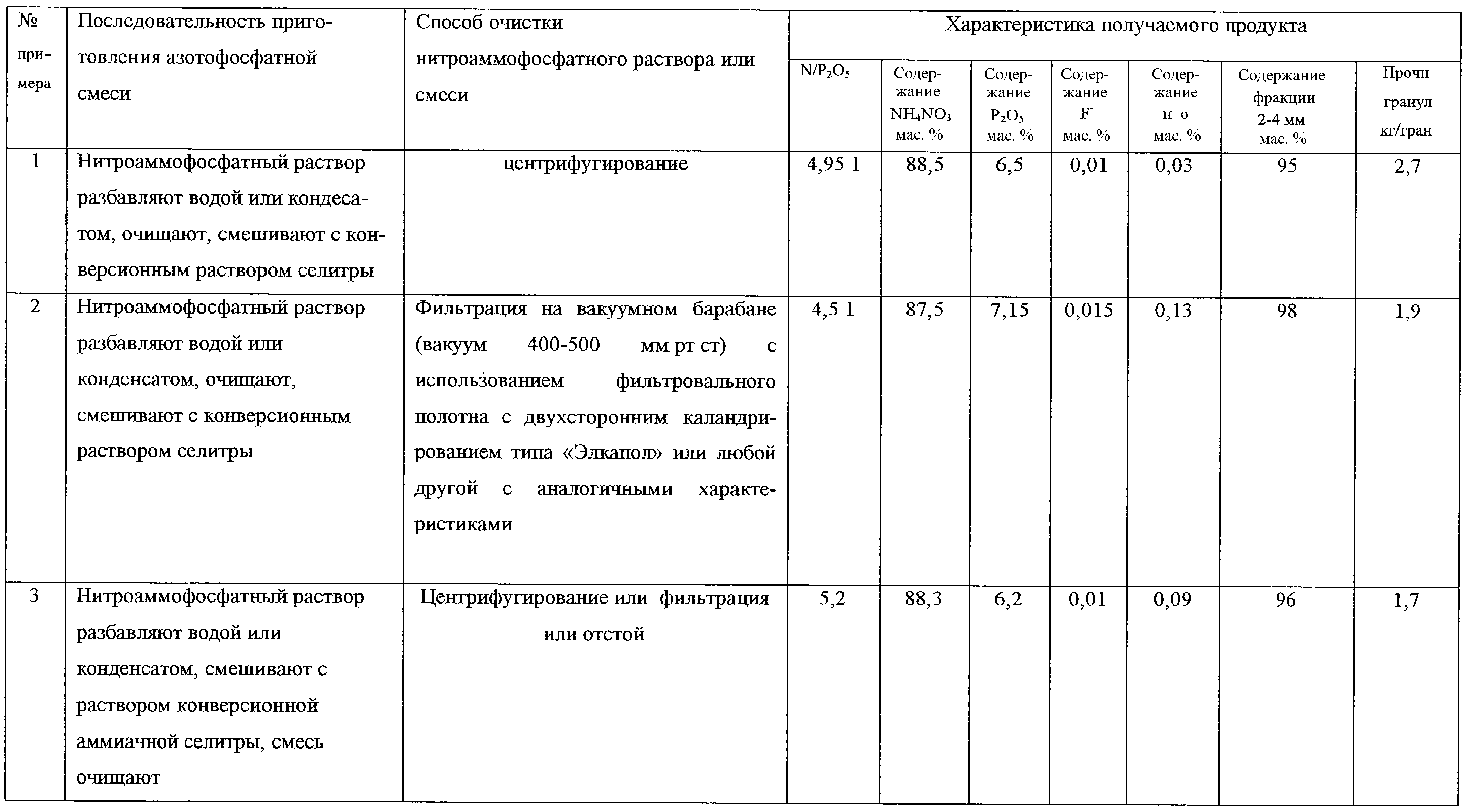 Указанный выше технический результат достигается в способе получения сложных водорастворимых азотно-фосфорных минеральных удобрений на основе аммиачной селитры и фосфорсодержащего компонента, включающем смешение фосфорсодержащего компонента и аммиачной селитры, двухстадийное выпаривание, гранулирование смеси методом приллирования с последующей обработкой получаемых гранул кондиционирующими добавками, причем в качестве фосфорсодержащего компонента используют нитроаммофосфатный раствор, полученный нейтрализацией азотно-кислотной вытяжки, образовавшейся в результате разложения апатита азотной кислотой с отделением нитрата кальция при соотношении в растворе N:P2O5водорастворимый, равном (1,1-3,1):1, который после разбавления водой или конденсатом до концентрации солей 55-65% смешивают с раствором конверсионной аммиачной селитры концентрацией 55-92% до соотношения N:P2O5водорастворимый, равного (2,3-11,3):1, при этом нитроаммофосфатный раствор или его смесь с конверсионной аммиачной селитрой очищают от водонерастворимых примесей, а выделенный при очистке осадок возвращают на стадию разложения апатита. При этом конверсионная аммиачная селитра содержит фтор-иона не более 0,01%, нерастворимого остатка – не более 0,1%.
