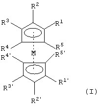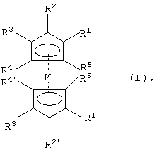 R2, R2’, R3, R3’, R4, R4’, R5, R5’, независимо друг от друга, выбирают из группы, состоящей из атома водорода, циклоалкила, арила или алкила, который может быть прерван атомом кислорода или может быть замещен остатком формулы NE1E2, причем Е1 и Е2 могут быть одинаковыми или разными и означают алкил, циклоалкил или арил, или, смотря по обстоятельствам, два из заместителей R2, R3, R4, R5 и/или R2’, R3’, R4’, R5’ в соседних положениях вместе со связывающей их частью циклопентадиенильного кольца могут образовывать ароматический или неароматический от пяти- до семичленного карбоцикл или гетероцикл, который может включать один, два или три гетероатома, выбираемых из группы, состоящей из кислорода, азота и серы;