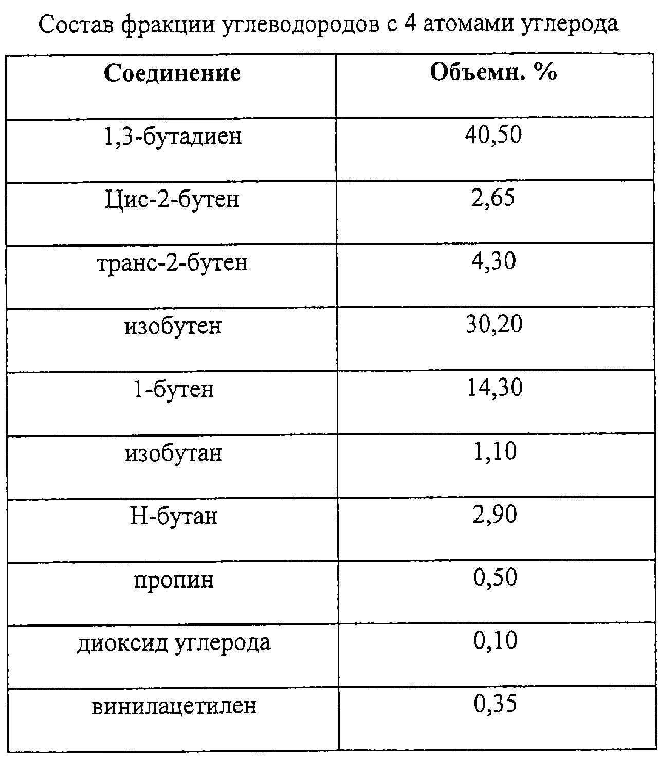 В стеклянном автоклаве в атмосфере аргона и при комнатной температуре смешивают 0,41 г бис(1,5-циклооктадиен)никеля (0), 0,80 г 1,1’-бис(дифенилфосфино)ферроцена и 10 мл толуола, причем реакционная смесь тотчас окрашивается в красно-бурый цвет. Спустя примерно один час добавляют смесь из 39 г фракции углеводородов с 4 атомами углерода указанного в таблице 1 состава в 50 г толуола. Стеклянный автоклав герметически закрывают и реакционную смесь нагревают до 80