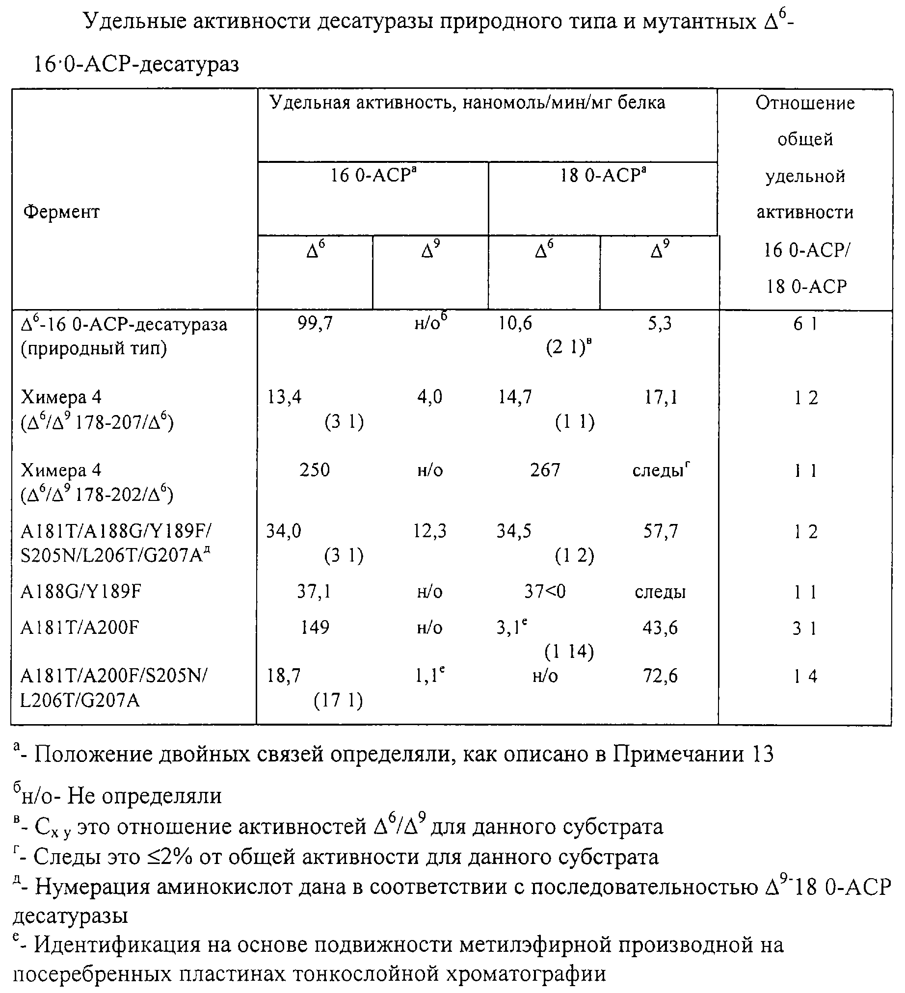 Ацил-АСР-десатуразы природного типа и мутантные получают путем экспрессии кодирующих последовательностей в Е. coli BL21 (DE3) под контролем промотора Т7 РНК-полимеразы с использованием векторов рЕТ3а или pET3d. Рекомбинантные ферменты, активность которых описана в таблице, очищают из бактериальных культур (объемом от 6 до 9 л), культивируемых при температуре от 20 до 25 С. Очистку белка осуществляют, используя DEAE-анионно-обменную хроматографию с последующей 20HS (фирма Персептив Байосистемз) катионно-обменной хроматографией с использованием жидкостной хроматографии высокого давления Байокад Спринт (фирма Персептив Байосистемз). Мутантные десатуразы были получены с чистотой r 90%, а 6-16:0-АСР-десатуразу природного типа выделяли с чистотой примерно 80%. После очистки ферменты подвергают обмену в буфере, состоящем из 40 ммоль/л гидрохлорида-Трис (рН 7,5), 40 ммоль/л хлорида натрия и 10% глицерина, и хранят в аликвотах при -75 С после мгновенного замораживания в жидком азоте.