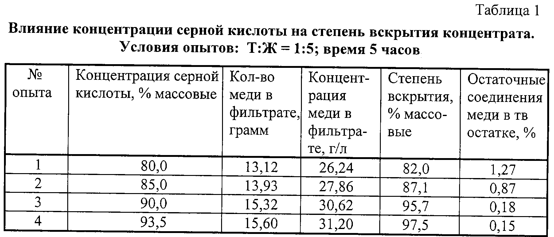 В результате действия концентрированной серной кислоты при высокой температуре и непрерывном помешивании пульпы сульфидные минералы концентрата разлагаются с образованием растворимых сульфатов металлов и выделением сернистого ангидрида, причем процесс разложения минералов, в отличие от прототипа, осуществляется при атмосферном давлении без применения автоклава и сопутствующего ему оборудования и без дополнительного подвода кислорода. Время 5-6 часов выбрано из условия наиболее полного разложения сульфидных минералов.