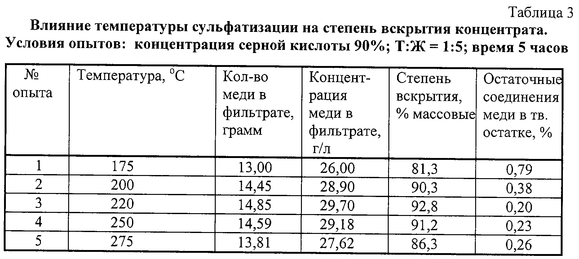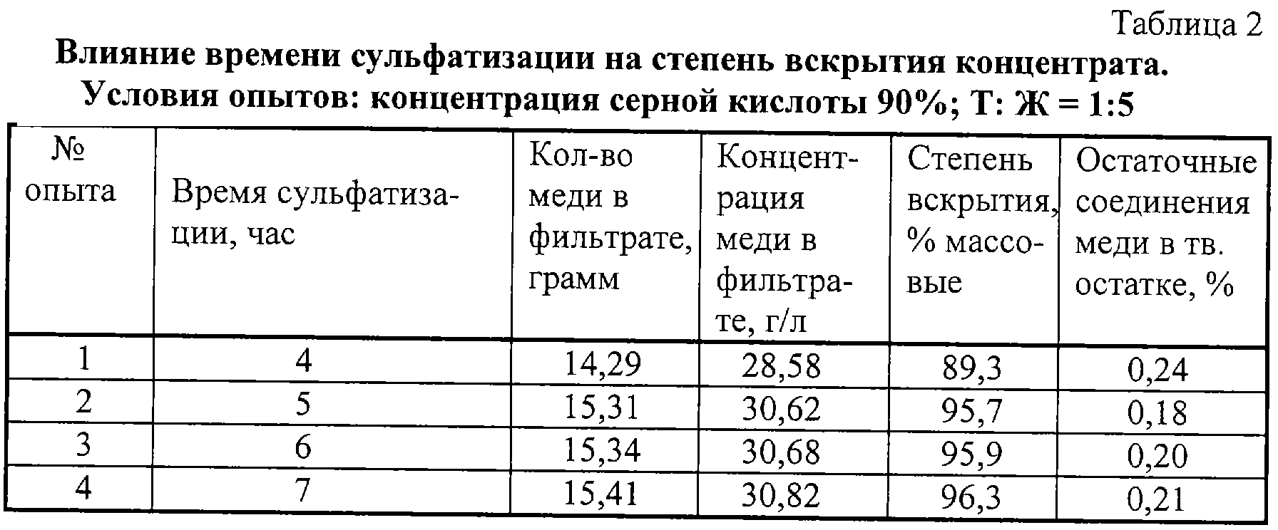 2. Время процесса сульфатизации с применением 90%-ной серной кислоты составляет 5-6 часов, когда степень вскрытия высокая, а содержание меди в твердом остатке наименьшее. Увеличение времени до 7 часов существенного влияния на процесс вскрытия не оказывает.