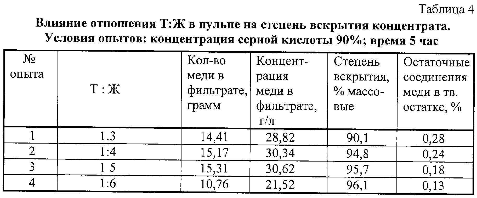 В табл.4 показано влияние отношения Т:Ж в пульпе на степень вскрытия концентрата. Условия опытов: концентрация серной кислоты 90%; температура нагрева пульпы – свыше 200 С; время сульфатизации 5 часов.