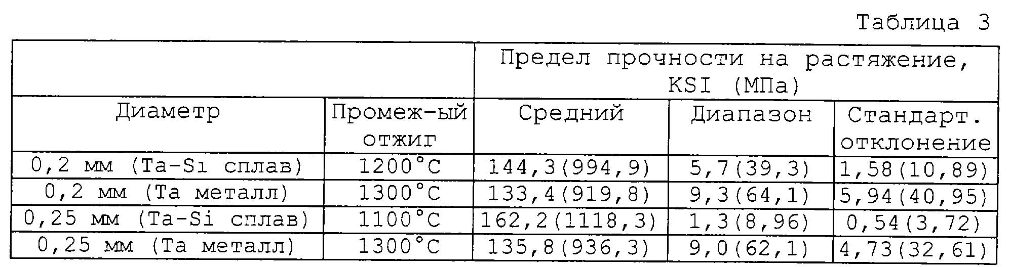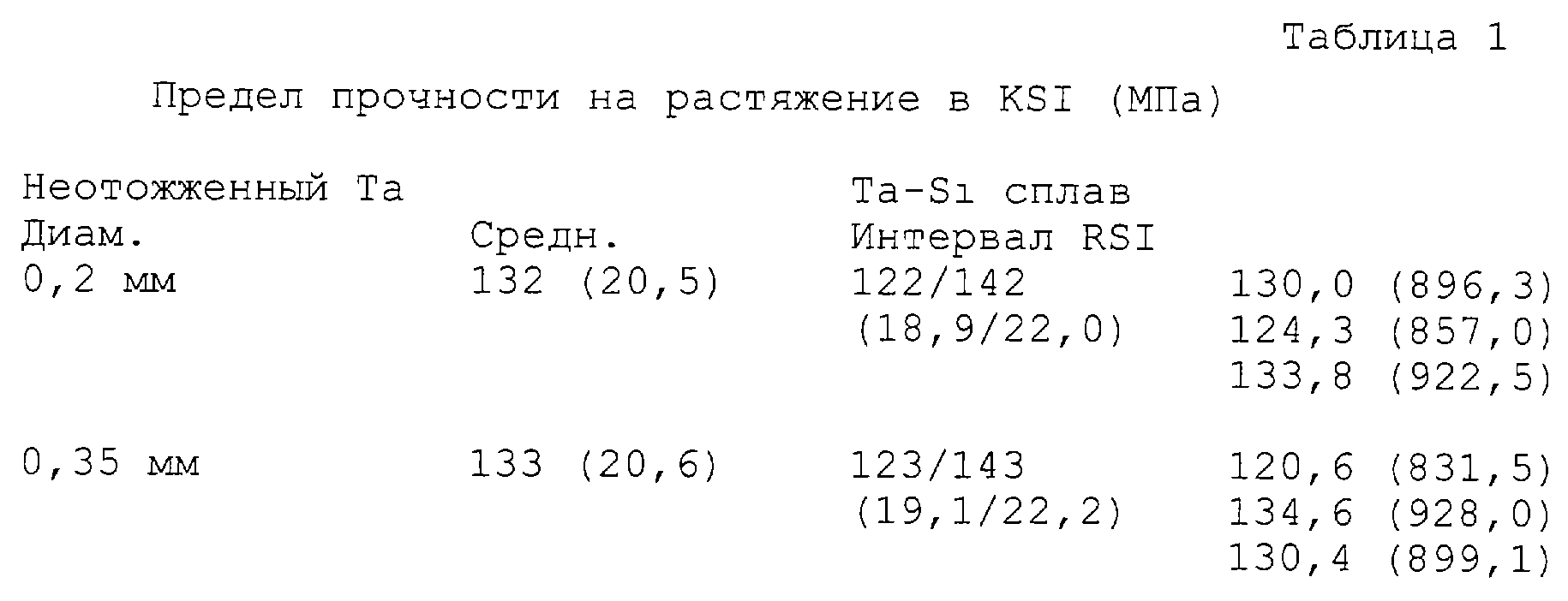 водород <5 ниобий <25 титан <5 железо 15 медь <5кобальт <5 бор <5 марганец <5 олово <5 никель <5 хром <5 натрий <5 алюминий <5 молибден <5 цирконий <5 марганец <5 вольфрам <5 При этом в танталовый порошок добавляли 1 мас.% Si (в виде элементарного порошкообразного кремния) из расчета на вес смеси. Смешанный порошок затем подвергали электронно-лучевой плавке в электронно-лучевой печи Лейболда мощностью 1200 кВт при скорости плавления 102,3 кг в час. После расплавления порошков сплав переводили в твердое состояние и снова подвергали переплаву электронно-лучевым методом при скорости плавления 268,5 кг в час. Полученный сплав содержал кремний в количестве от около 120 частей Si на миллион до около 150 частей Si на миллион. Полученный сплав подвергали механической обработке и ковке для получения прутка размером 10,16 см и подвергали чистовой обработке. Затем пруток отжигали при 1530°С в течение двух часов. После этого пруток подвергали 5 дополнительным промежуточным отжигам при 1300°С в течение двух часов, прокатывали и вытягивали до получения проволоки диаметром 0,2 мм и диаметром 0,25 мм, часть этой проволоки подвергали отжигу ниткой при температуре от 1500°С до 1600°С с тремя разными скоростями (17,8, 15,2 и 12,7 см/сек), а остальную проволоку оставляли неотожженной. Этот образец сравнивали с неотожженным металлом на основе тантала, полученным методом порошковой металлургии, обработанным таким же образом, но без добавления Si. Исследованные образцы проволоки имели следующие показатели предела прочности на растяжение, измеренные в соответствии с ASTM Е-8.