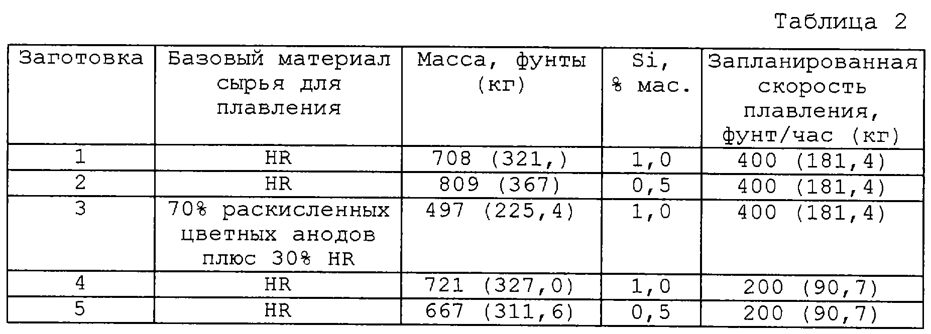 Предпочтительно, сплав после этого переводят в жидкое состояние или расплавляют более одного раза, предпочтительно, по меньшей мере, два или более раза. При плавлении более двух раз первое расплавление производят предпочтительно со скоростью около 181 кг в час, а второе – предпочтительно со скоростью около 318 кг в час. Таким образом, полученный сплав можно переводить в жидкое состояние любое количество раз, чтобы получить более чистый сплав и способствовать доведению уровней кремния до заданных пределов в готовой продукции, так как кремний или содержащее кремний вещество может быть в избытке.