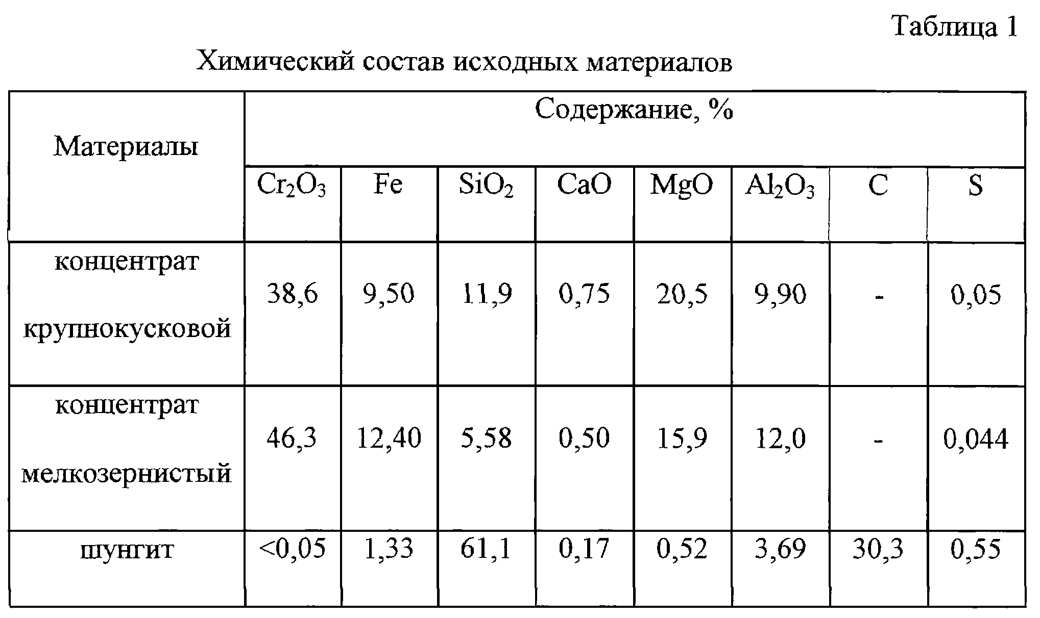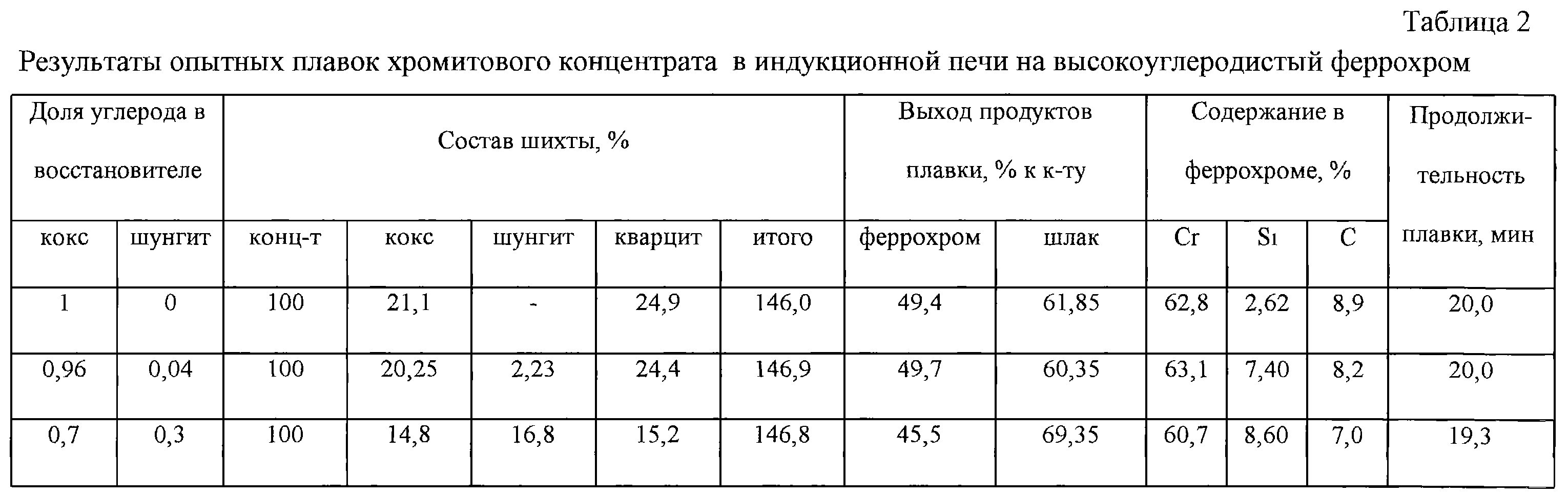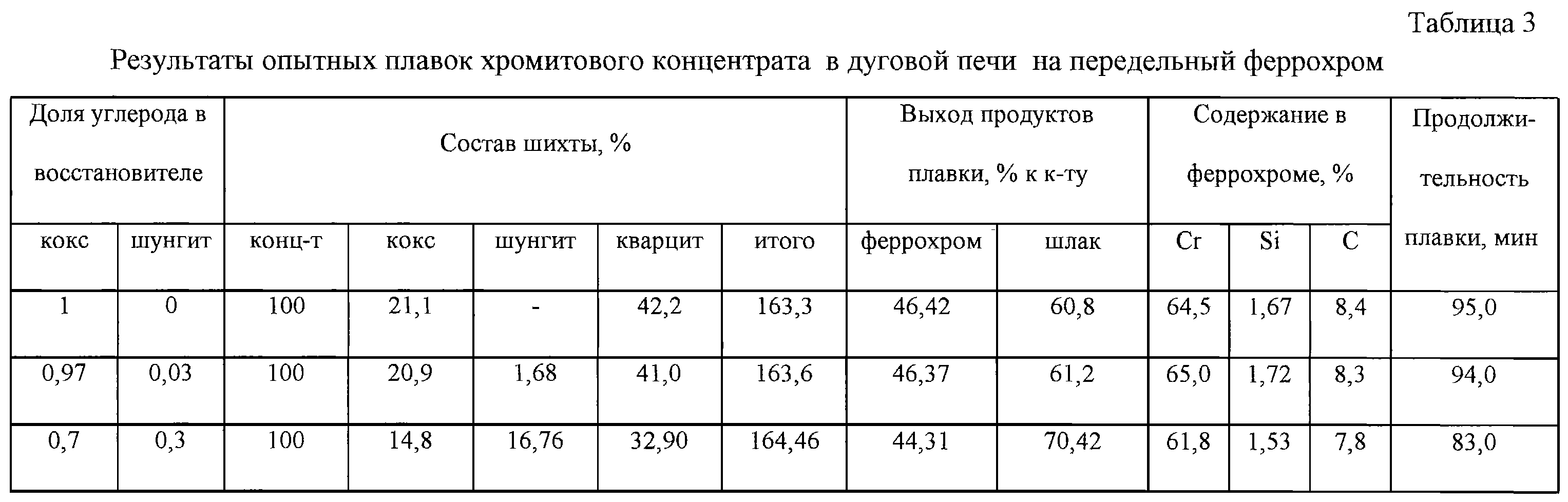 Таким образом, в процессе углетермического восстановления хромистого сырья до феррохрома в шихту вводят шунгит в количестве, необходимом для замены 3-30% углерода кокса углеродом шунгита, частично заменяя при этом количество необходимого кварцевого флюса в шихте. Кроме того, благодаря более высокой реакционной способности шунгита при плавке хромитового концентрата с установленным выше относительным расходом шунгита сокращается продолжительность плавки на 3,5-13,0% по сравнению с плавкой концентрата с использованием кокса.
