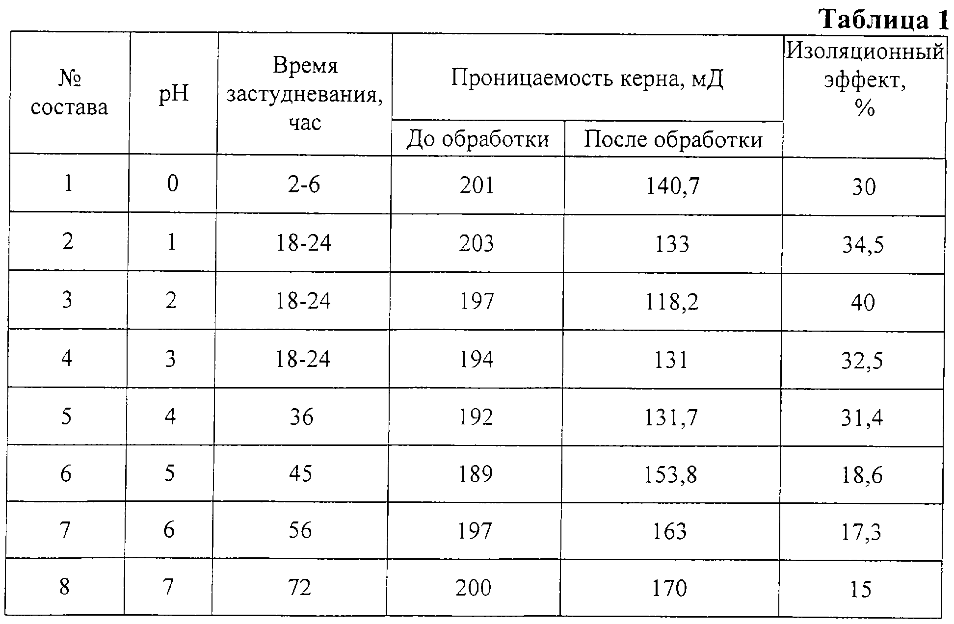 В таблице 1 представлены результаты экспериментов по изучению изолирующей способности составов на основе водных растворов соляной кислоты и цеолита при различных рН. Составы готовились путем смешения цеолита с растворами соляной кислоты при различной концентрации хлористого водорода до получения однородной жидкости.