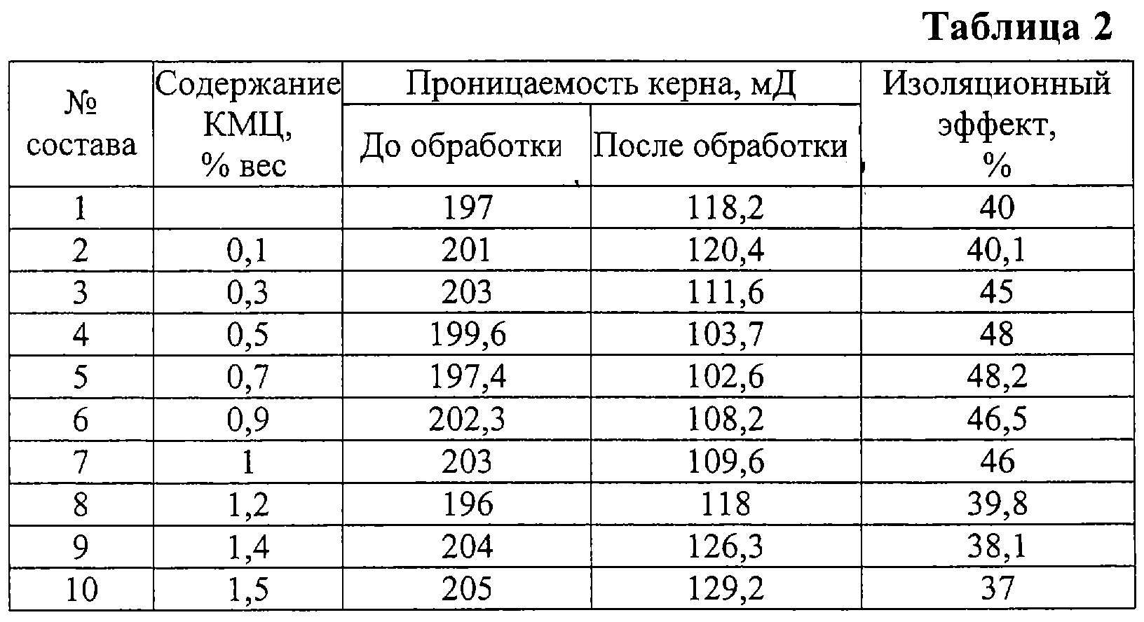 В изоляционный состав или хотя бы в один из его компонентов можно дополнительно ввести модифицирующие вещества, например водорастворимые полимеры (полиакриламид, гипан, КМЦ, крахмал), ПАВ, полиэлектролиты. В таблице №2 представлены результаты изучения изолирующего эффекта изоляционных составов на основе цеолита при рН 2 с добавлением полимера карбоксиметилцеллюлозы марки КМЦ-500.