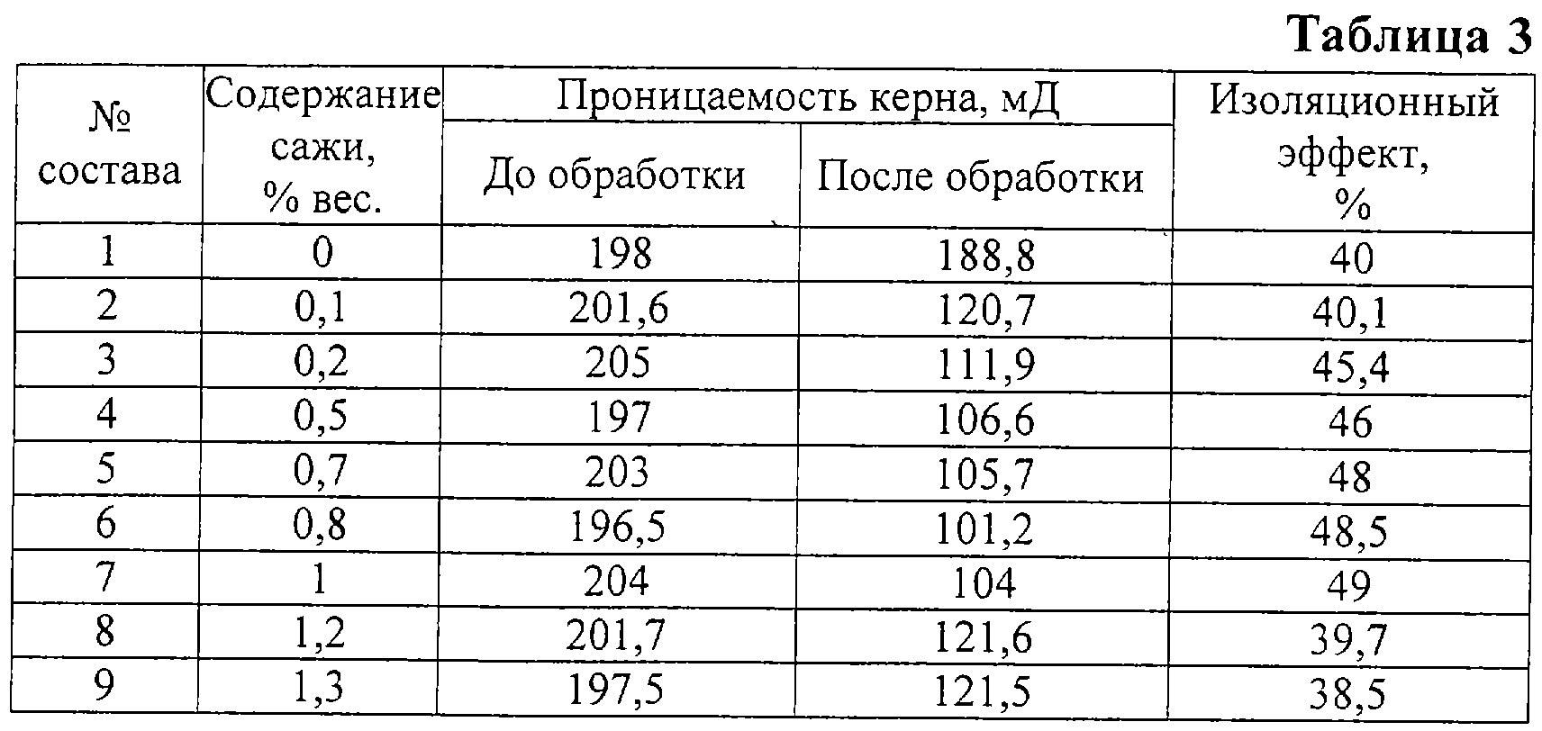 При высокой проницаемости пласта или сильном поглощении можно в качестве хотя бы одного компонента использовать диспергированный материал, например сажу, цемент, известь, мел, золу-унос, глину, маршаллит, крокус, магнезиты, алюминиевую пудру, древесные опилки, гипс, вермикулит, которые могут служить как в качестве наполнителя, так и выступать в роли добавки, придающей изоляционному составу дополнительные качества, которые повышают тампонирующие свойства. В табл. №3 приведен изоляционный эффект для изоляционных составов на основе цеолита при рН 2 с добавлением наполнителя – сажи.